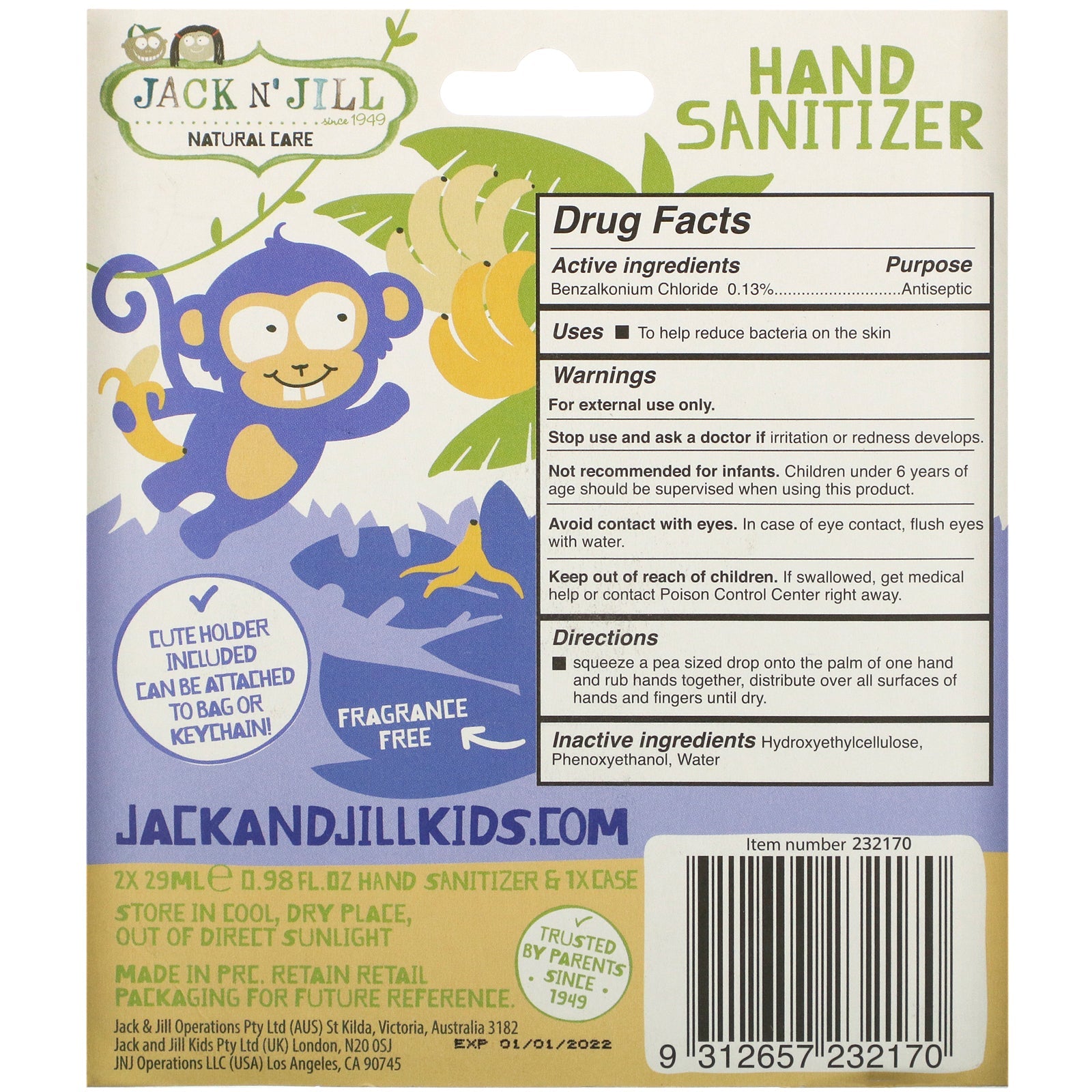 Jack n' Jill, Hand Sanitizer, Monkey, 2 Pack, 0.98 fl oz (29 ml) Each and 1 Case