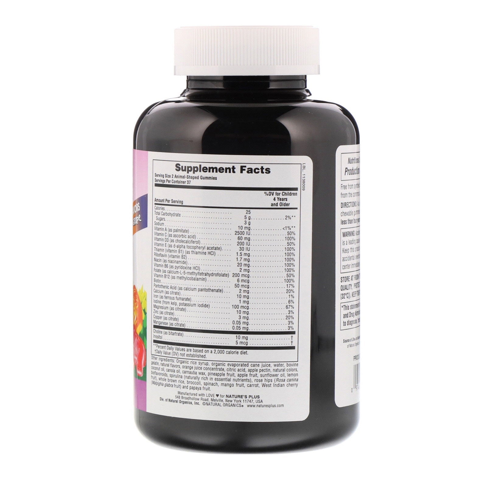 Multi-Vitamin and Mineral Supplement With Whole Food Concentrates Gluten Free Nutritional Support for Natural Energy Production and Overall Well-Being.Sugg. UseAs a dietary supplement for children, two chewable gummies once daily. Not intended for children less than four years of age.Other IngredientsOrganic rice syrup, organic evaporated cane juice, water, bovine gelatin, natural flavors, organic juice concentrate, citric acid, apple pectin, natural colors, coconut oil, canola oil, carnauba wax, pineapple fruit, apple fruit, sunflower oil, lemon bioflavonoids, spirulina (naturally rich in essential nutrients), rose hips (rosa canina fruit), whole brown rice, broccoli, spinach, mango fruit, carrot, west indian cherry (malpighia glabra fruit) and papaya fruit. Free from synthetic colors and preservatives. Free from the common allergens yeast, wheat, soy and milk.Supplement FactsServing Size: 2 Animal-Shaped Gummies Servings Per Container: 37 Amount Per Serving %DV for Children 4 Years and Older Calories 25 Total Carbohydrate 5 g 2%** Sugars 3 g Sodium 10...