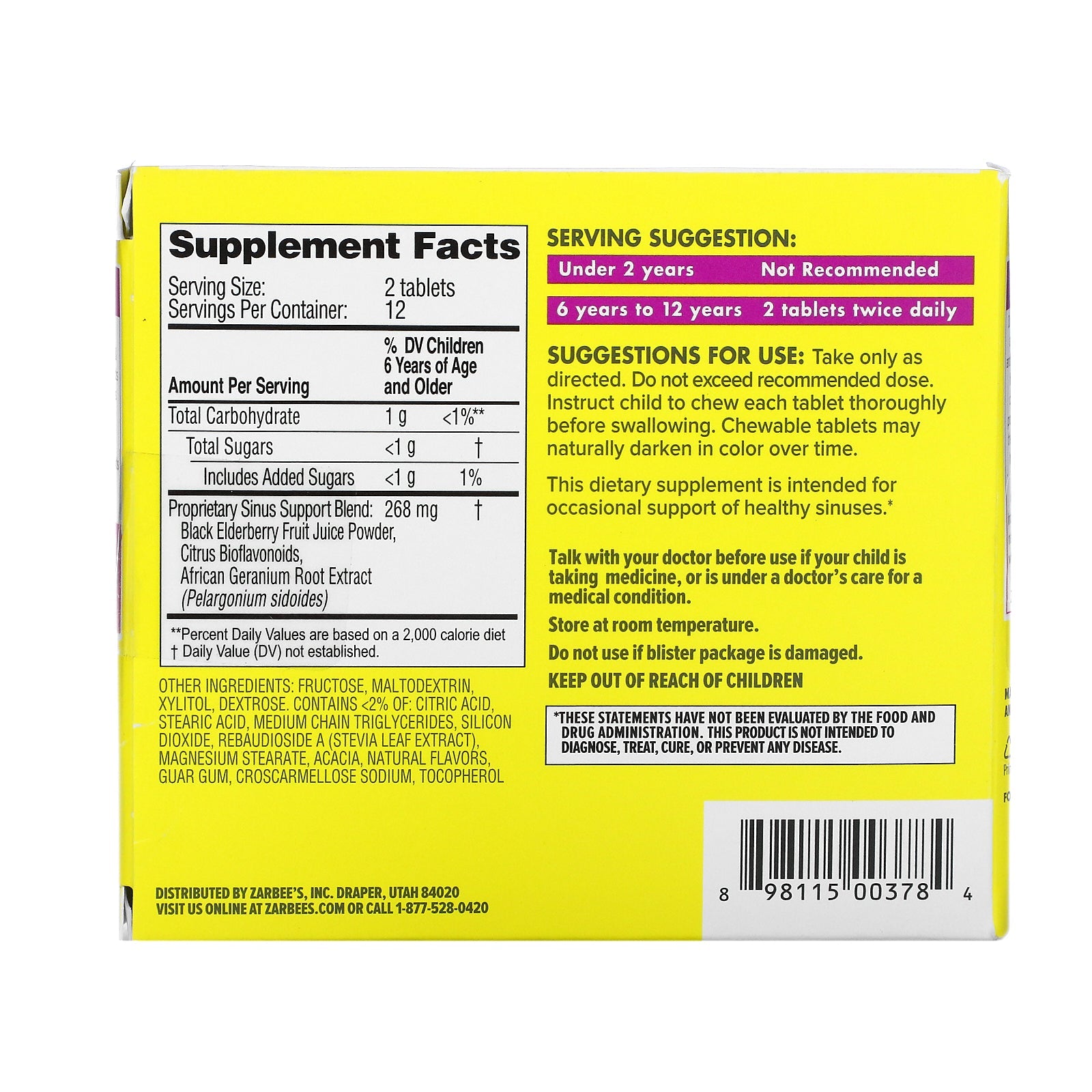 To Provide Sinus, Nasal & Respiratory Support Safe & Effective Everyday Sinus Health Support Non-Drowsy Dietary Supplement With Other Natural Flavors No Drugs or Alcohol No Artificial Flavors Gluten-Free From the makers of #1 Pediatrician Recommended‡ - ‡Cough Syrup Brand for Children 10 Years and Under. This dietary supplement is intended for occasional support of healthy sinuses. Safe & Effective With African Geranium Root & citrus bioflavonoids to promote sinus & respiratory health Citrus bioflavonoids for antioxidant support Zarbee's Story Dr. Zak Zarbock, a pediatrician and father, couldn't find effective chemical-free products to keep the whole family healthy, so he created his own products including handpicked natural ingredients, whenever possible. The result is Zarbee's Naturals.Sugg. UseUnder 2 years : Not recommended 6 years to 12 years: 2 tablets twice daily Take only as directed. Do not exceed recommended dose. Instruct child to chew each tablet thoroughly before swallowing. Chewable tablets...