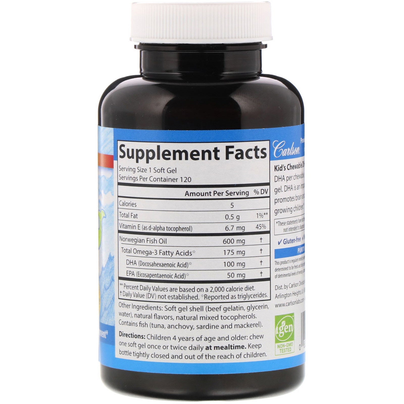 Freshness & Potency Purity Guaranteed 100 mg DHA Dietary Supplement Brain Health Vision Support Growth & Development Carlson Providing the Finest Norwegian Omega-3s Since 1982 Gluten Free No Artificial Preservatives An FDA Regulated Facility Igen Non-GMO Tested Kid's Chewable DHA provides 100 mg of DHA per chewable, orange flavored soft gel. DHA is an important omega-3 that promotes brain and vision development in growing children.Sugg. UseChildren 4 years of age and older: Chew one soft gel once or twice daily at mealtime.Other IngredientsSoft gel shell (beef gelatin, glycerin, water), natural flavors, natural mixed tocopherols. Contains fish (tuna, anchovy, sardine and mackerel). Purity Guaranteed: This product is regularly tested by independent FDA registered laboratories. It has been determined to be fresh and fully potent (per ACOS international protocols) and is free of detrimental levels of mercury, cadmium, lead, PCBs and 28 other contaminants.Supplement FactsServing Size: 1 Soft Gel Servings Per Container:...