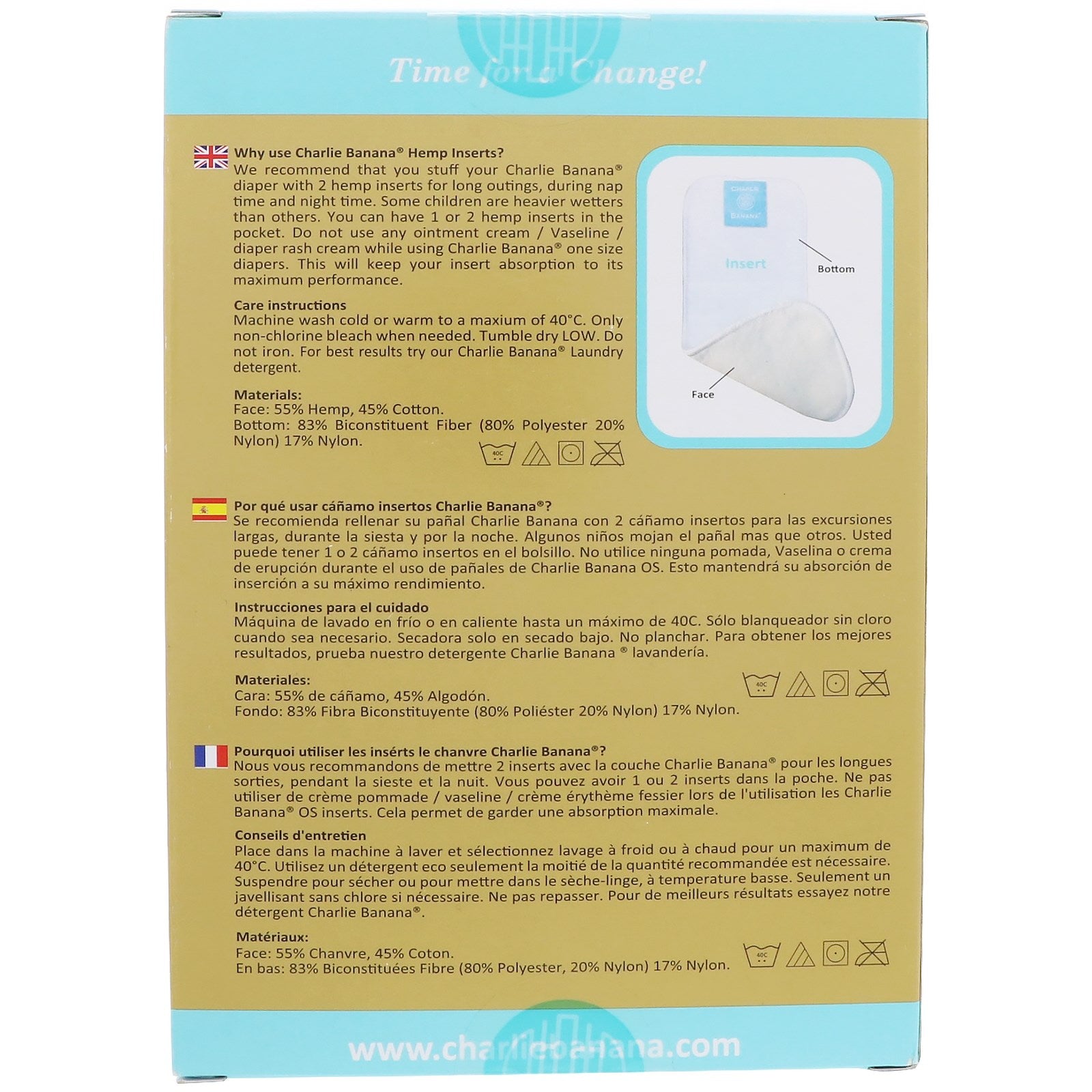 Healthy, Eco Friendly, Economical Time for a Change Why use Charlie Banana Hemp Inserts? We recommend that you stuff your Charlie Banana diaper with 2 hemp inserts for long outings, during nap time and night time. Some children are heavier wetters than others. You can have 1 or 2 hemp inserts in the pocket. Do not use any ointment cream / vaseline / diaper rash cream while using Charlie Banana one size diapers. This will keep your insert absorption to its maximum performance.Sugg. UseMachine wash cold or warm to a maximum of 40ºC. Only non-chlorine bleach when needed. Tumble dry LOW. Do not iron. For best results try our Charlie Banana Laundry detergent.Other IngredientsFace: 55% hemp, 45% cotton. Bottom: 83% Biconstituent Fiber (80% polyester 20% nylon) 17% nylon.Supplement FactsDisclaimerWhile VitaminsUK strives to ensure the accuracy of its product images and information, some manufacturing changes to packaging and/or ingredients may be...