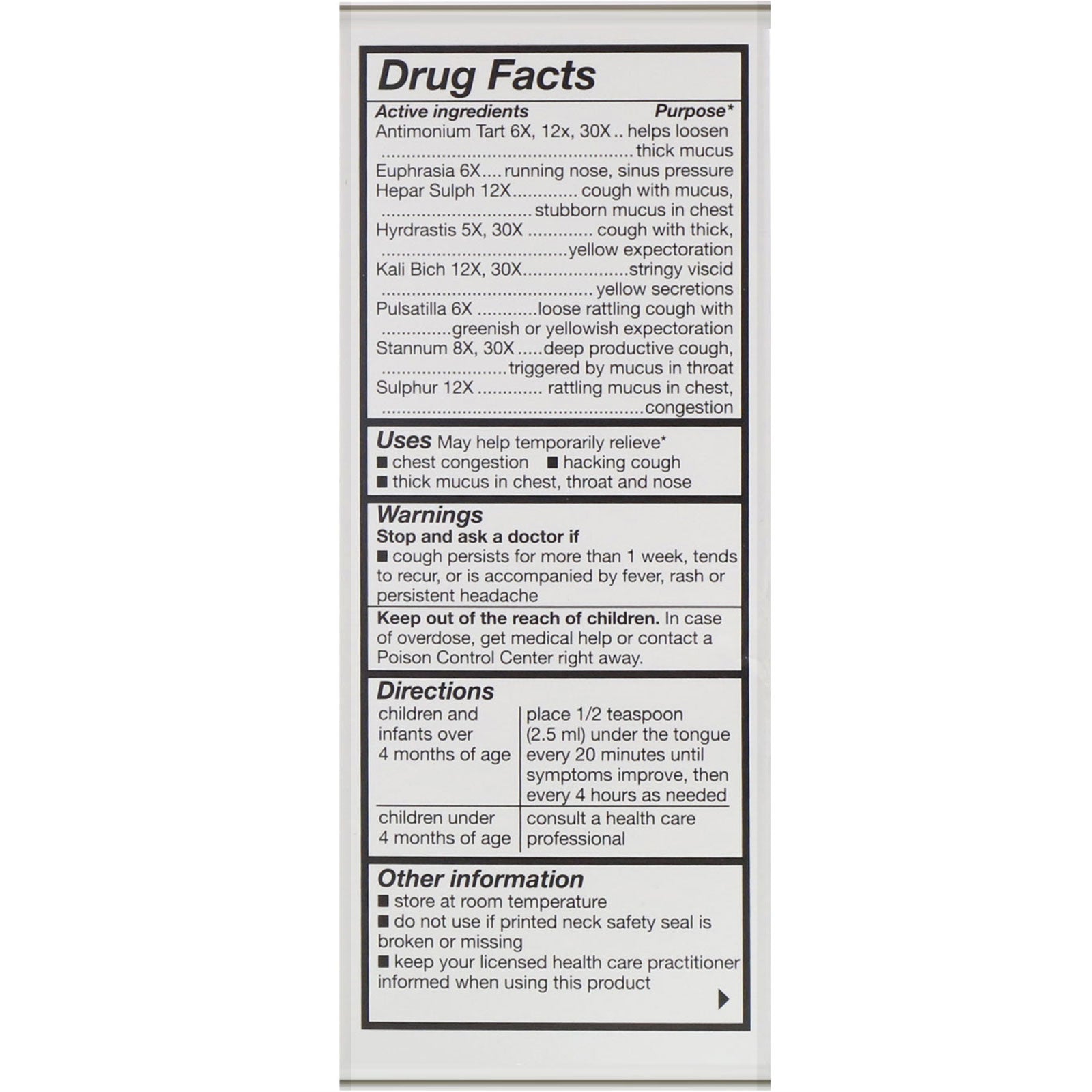 Drug Facts Active Ingredients Purpose* Antimonium Tart 6X, 12x, 30X Helps loosen thick mucus Euphrasia 6X Running nose, sinus pressure Hepar Sulph 12X Cough with mucus, stubborn mucus in chest Hydrastis 5X,30 X Cough with thick, yellow expectoration Kali Bich 12X, 30X Stringy viscid yellow secretions Pulsatilla 6X Loose rattling cough with greenish or yellowish expectoration Stannum 8X, 30X Deep productive cough, triggered by mucus in throat Sulphur 12X Rattling mucus in chest, congestion Inactive Ingredients Citric acid, glycerin, purified water, natural mixed berry flavor, sodium benzoate. *Based exclusively on references from homeopathic Materia Medica, HPUS and literature.Supplement Facts