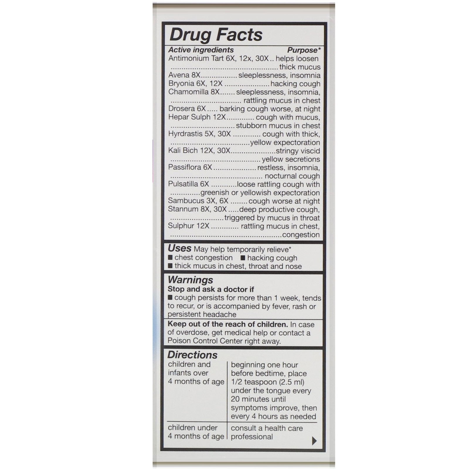 Drug Facts Active Ingredients Purpose* Antimonium Tart 6X, 12x, 30X Helps loosen thick mucus Avena 8X Sleeplessness, insomnia Bryonia 6X, 12X Hacking cough Chamomilla 8X Sleeplessness, insomnia, rattling mucus in chest Drosera 6X barking cough worse, at night Hepar Sulph 12X Cough with mucus, stubborn mucus in chest Hydrastis 5X, 30X Cough with thick, yellow expectoration Kali Bich 12X, 30X Stringy viscid yellow secretions Passiflora 6X Restless, insomnia nocturnal cough Pulsatilla 6X Loose rattling cough with greenish or yellowish expectoration Sambucus 3X, 6X Cough worse at night Stannum 8X, 30X Deep productive cough, triggered by mucus in throat Sulphur 12X Rattling mucus in chest, congestion Inactive Ingredients Citric acid, glycerin, purified water, natural mixed berry flavor, sodium benzoate. *Based exclusively on references from homeopathic Materia Medica, HPUS and literature.Supplement Facts