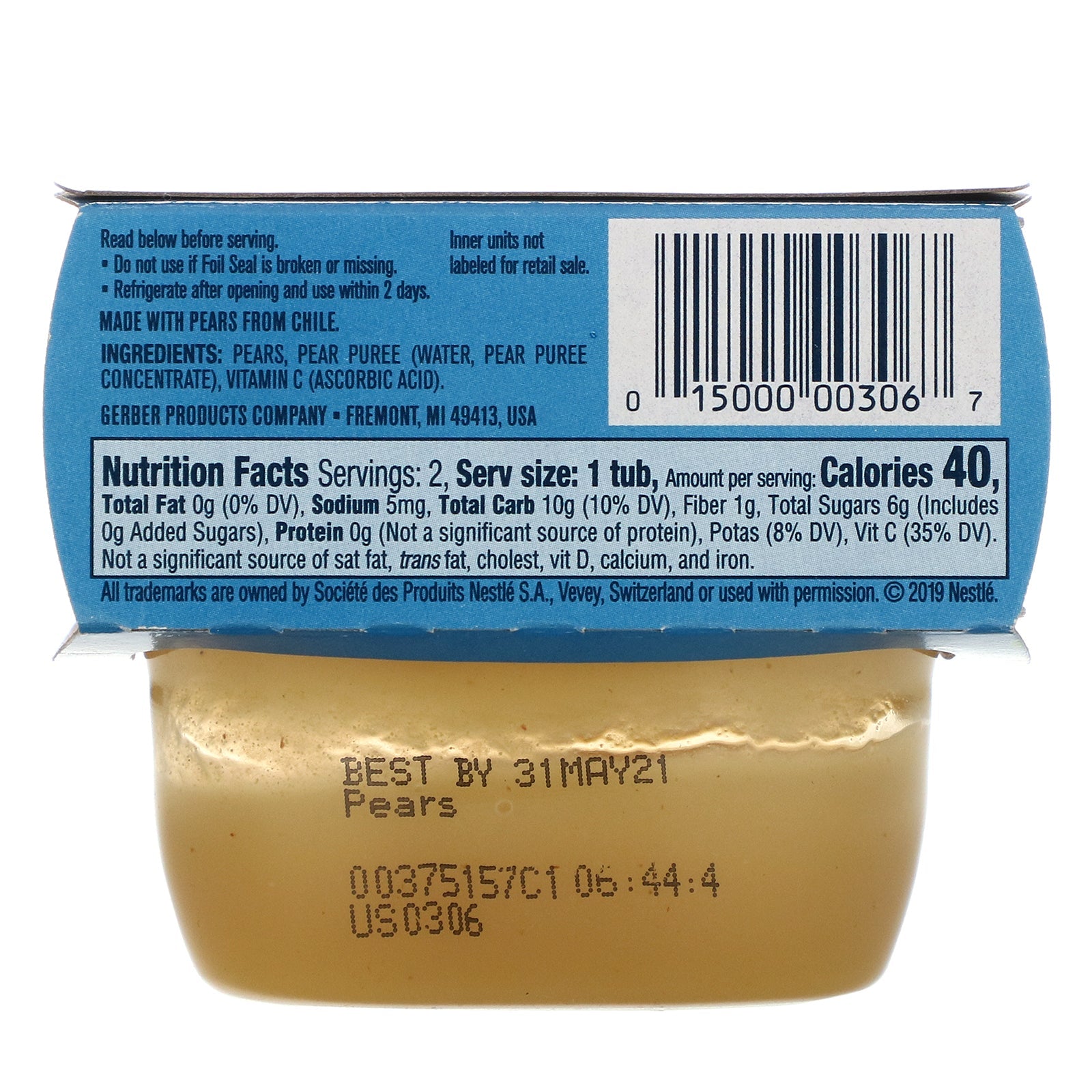 Supported Sitter 1st Foods® Non GMO Project Verified No Artificial Flavors or Colors Packaging Made with No BPA The Goodness Inside: 1/3 Pear in Each Tub Made with Pears from Chile These pears were grown using our Clean Field Farming™ practices.Sugg. UseBaby foods may be served at room temperature or warmed. You can feed your baby directly from each convenient tub. If one tub is too large for your baby, spoon out the desired portion into another dish for feeding and refrigerate the unused portion to enjoy later (within 2 days of opening). If you feed directly from the container, discard any unused portion. To warm: 1. Remove foil seal completely and discard 2. Heat on high for 15 seconds in microwaves up to 1500w 3. Stir. Always test temperature (by tasting) before servingOther IngredientsPears, pear puree (water, pear puree concentrate), vitamin C (ascorbic acid).Supplement FactsServing Size: 1 tub Servings...