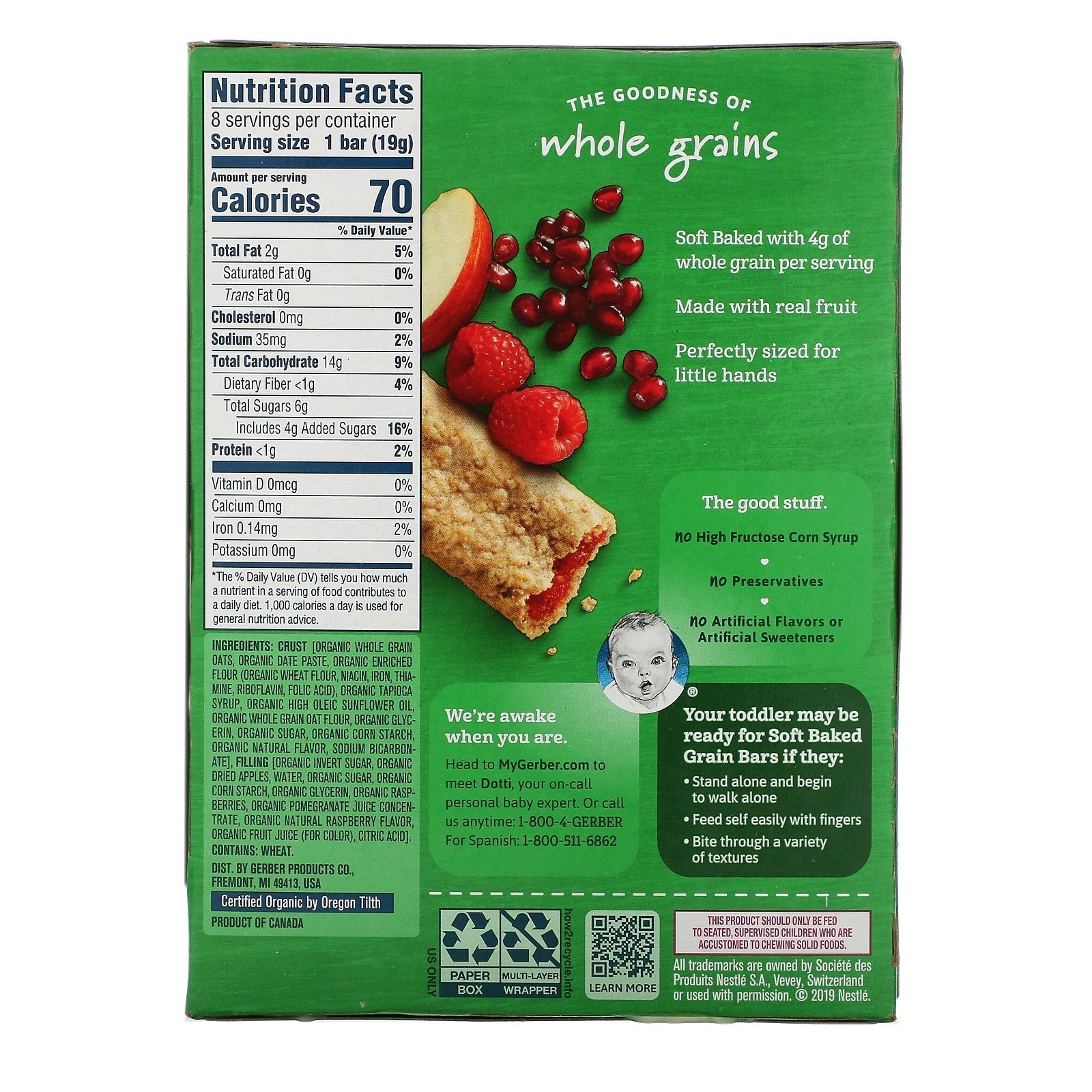 Baked with 4 g of Whole Grains Per Serving No Artificial Flavors No Artificial Sweeteners No Preservatives Naturally Flavored with Other Natural Flavors Non GMO - Not Made with Genetically Engineered Ingredients USDA Kosher Dairy Toddler Certified by Oregon Tilth The Goodness of Whole Gains Soft Baked with 4 g of whole grain per serving Made with real fruit Perfectly sized for little hands The good stuff. No High Fructose Corn Syrup No Preservatives No Artificial Flavors or Artificial SweetenersSugg. UseYour toddler may be ready be ready for soft baked Grain Bars if they: Stand alone and begin to walk alone Feed self easily with fingers Bite through a variety of texturesOther IngredientsCrust [ whole grain oats, date paste, enriched flour ( wheat flour, niacin, iron, thiamine, riboflavin, folic acid), tapioca syrup, high oleic sunflower oil, whole grain oat flour, glycerin, sugar, corn starch, natural flavor, sodium bicarbonate], filling [...