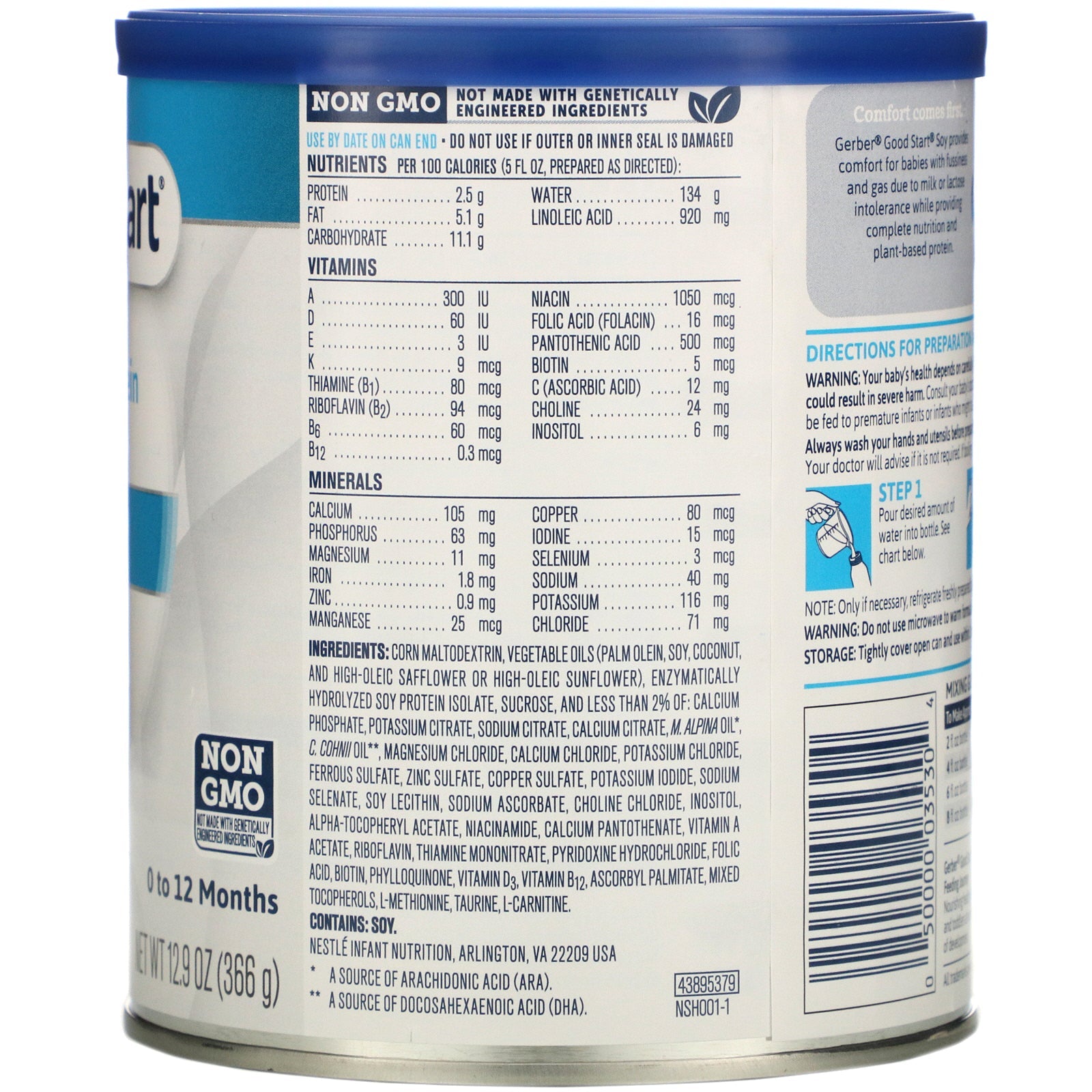 Soy Plant-Based Protein Brain & Eye Development DHA Easy to Digest Soy Proteins Milk Free Halal Kosher Pareve Soy Based Powder Non GMO - Not Made with Genetically Engineered Ingredients Comfort comes first. Gerber® Good Start® Soy provides comfort for babies with fussiness and gas due to milk or lactose intolerance while providing complete nutrition and plant-based protein. The goodness inside. Specially designed to provide complete nutrition with 100% plant-based soy proteins to ease digestion and expert-recommended DHA to help support brain and eye development. Gerber® Good Start® Feed Journey Nourishing healthy babies and toddlers at each stage of development Gerber® Good Start® Soy Birth-12 months Gerber® Good Start® Soy 2 9-24 months