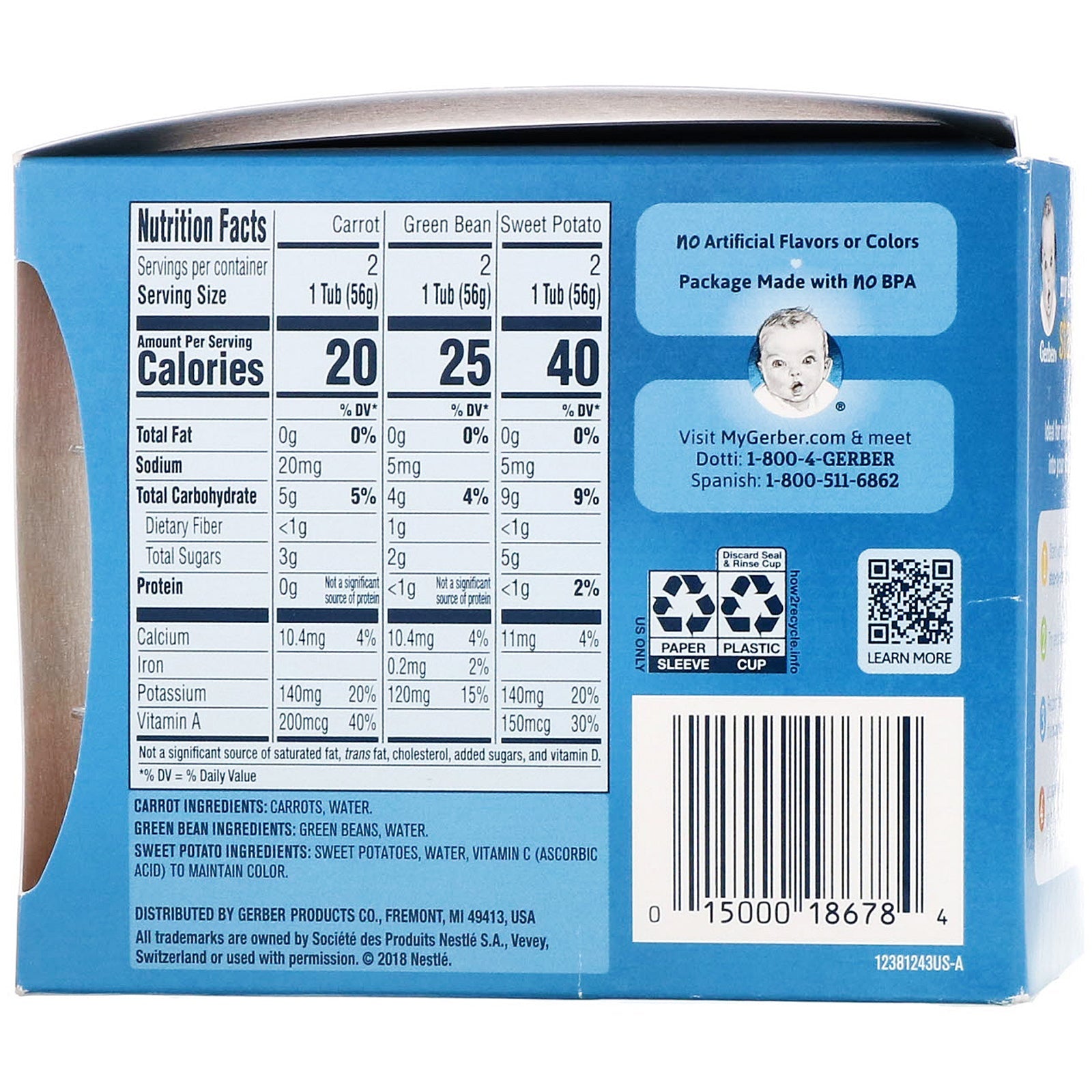 Serving Size: 1 Tub (56 g) Serving Per Container: 2 Carrot Green Bean Sweet Potato Amount Per Serving %Daily Value* Amount Per Serving %Daily Value* Amount Per Serving %Daily Value* Calories 20 25 40 Total Fat 0 g 0% 0 g 0% 0g 0% Sodium 20 mg 5 mg 5 mg Total Carbohydrate 5 g 5% 4 g 4% 9 g 9% Dietary Fiber <1 g 1 g <1 g Total Sugars 3 g 2 g 5 g Protein 0 g Not a significant source of protein <1 g Not a significant source of protein <1 g 2% Calcium 10.4 mg 4% 10.4 mg 4% 11 mg 4% Iron 0.2 mg 2% Potassium 140 mg 20% 120 mg 15% 140 mg 20% Vitamin A 200 mcg 40% 150 mcg 30% Not a significant source of saturated fat, trans fat, cholesterol, added sugars, and vitamin D.Disclaimer