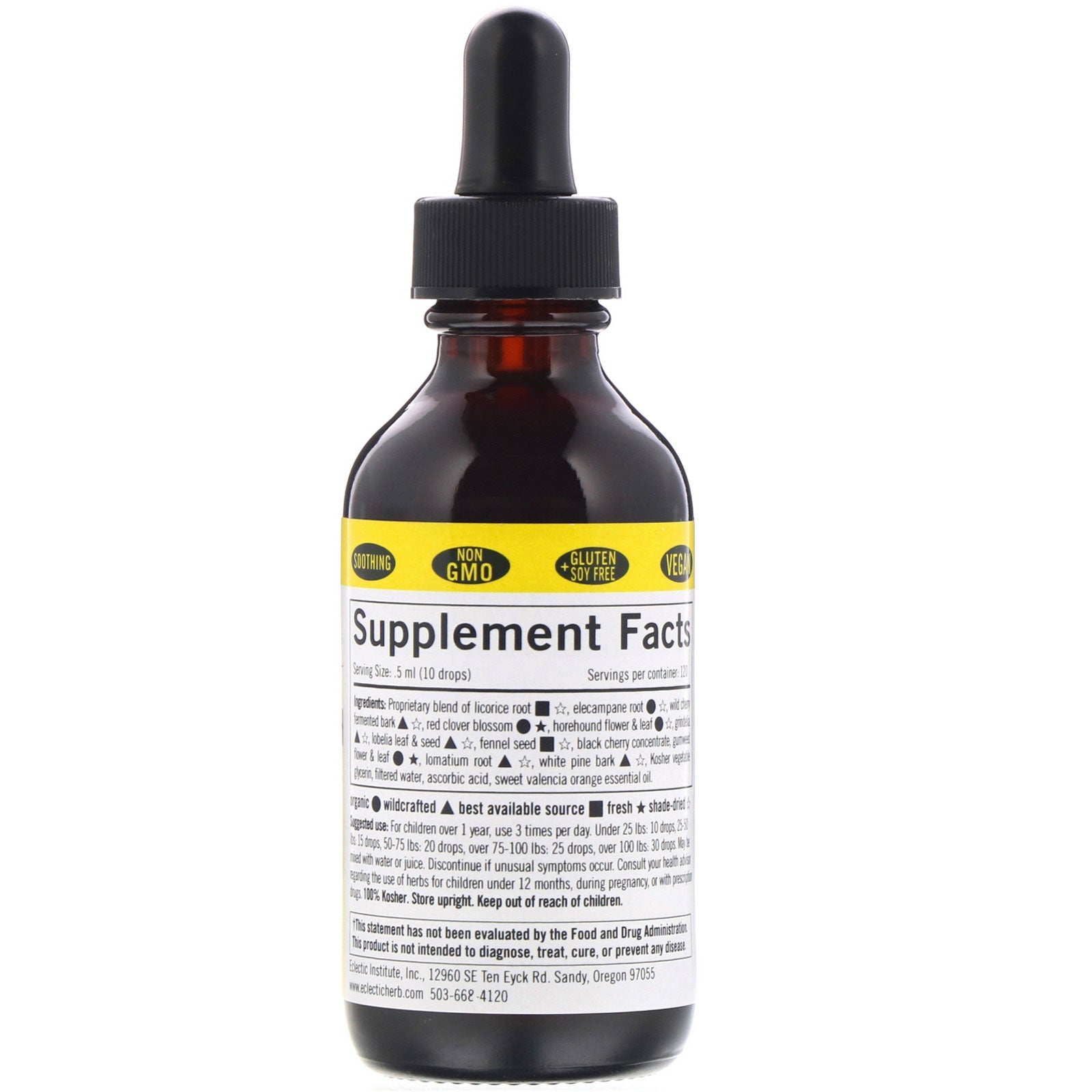Since 1982 Dietary Supplement Soothing Non GMO Gluten + Soy Free Vegan 100% KosherSugg. UseFor children over 1 year, use 3 times per day. Under 25 lbs: 10 drops, 25-50 lbs: 15 drops, 50-75 lbs: 20 drops, over 75-100 lbs: 25 drops, over 100 lbs: 30 drops. May be mixed with water or juice.Other IngredientsSupplement FactsServing Size: .5 ml (10 drops) Serving Per Container: 120 Ingredients: Proprietary blend of licorice root ■ ◊, elecampane root •◊, wild cherry fermented bark ▲ ◊, red clover blossom • ♦, horehound flower & leaf • ◊, grindelia flower & leaf •♦ , lomatium root ▲ ◊, white pine bark ▲ ◊, Kosher vegetable glycerin, filtered water, ascorbic acid, sweet valencia orange essential oil. Organic • wildcrafted ▲ best available source ■ fresh ♦ shade-dried ◊DisclaimerWhile VitaminsUK strives to ensure the accuracy of its product images and information, some manufacturing changes to packaging and/or...