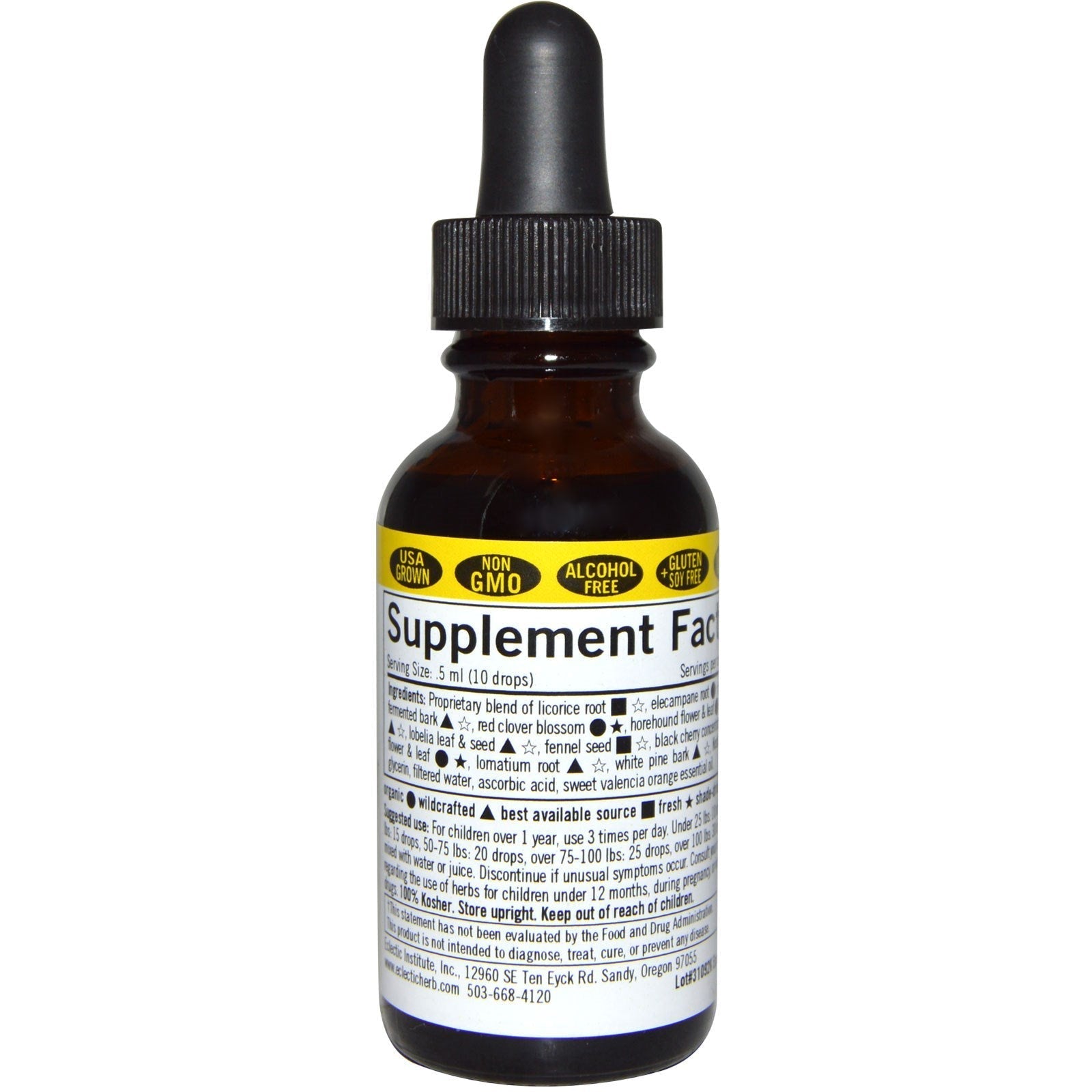 Since 1982 Dietary Supplement USA Grown Non GMO Alcohol Free Gluten + Soy Free Vegan 100% KosherSugg. UseFor children over 1 year, use 3 times per day. Under 25 lbs: 10 drops, 25-50 lbs: 15 drops, 50-75 lbs: 20 drops, over 75-100 lbs: 25 drops, over 100 lbs: 30 drops. May be mixed with water or juice.Other IngredientsSupplement FactsServing Size: l5 ml (10 drops) Servings per container: 60 Amount Per Serving % Daily Value Proprietary blend of licorice root ▪ ☆, elecampane root • ☆, wild cherry fermented bark Δ ☆, red clover blossom • *, horehound flower & leaf • ☆, grindelia Δ &9734;, lobelia leaf & seed Δ ☆, fennel seed ▪ ☆, black cherry concentrate, gumweed flower & leaf • *, lomatium root Δ ☆, white pine bark Δ ☆, kosher vegetable glycerin, filtered water, ascorbic acid, sweet valencia orange essential oil. Organic • Wildcrafted Δ Best...