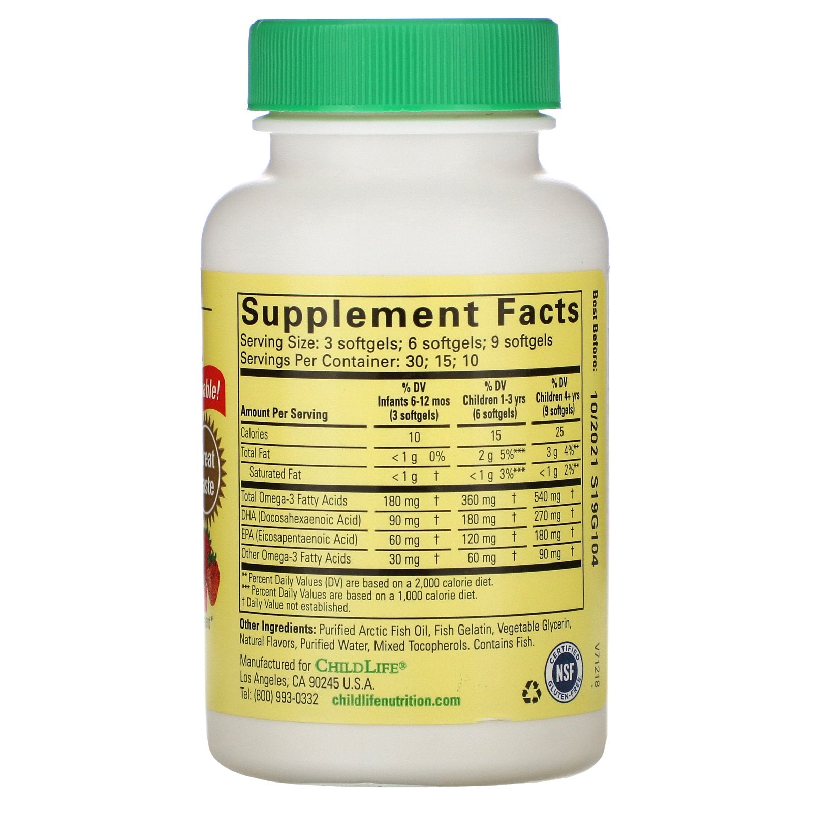 Serving Size: 3 softgels; 6 softgels; 9 softgels Servings Per Container: 30; 15; 10 Amount Per Serving %DV Infants 6-12 mos (3 softgels) %DV Children 1-3 yrs (6 softgels) %DV Children 4+ yrs (5 softgels) Calories 10 15 25 Total Fat <1 g 0% 2 g 5%*** 3 g 4%** Saturated Fat <1 g † <1 g 3%*** <1 g 2%** Total Omega-3 Fatty Acids 180 mg † 360 mg † 540 mg † DHA (Docosahexaenoic Acid) 90 mg † 180 mg † 270 mg † EPA (Eicosapentaenoic Acid) 60 mg † 120 mg † 180 mg † Other Omega-3 Fatty Acids 30 mg † 60 mg † 90 mg † **Percent Daily Values (DV) are based on a 2,000 calorie diet. ***Percent Daily Values are based on a 1,000 calorie diet. † Daily Value not established.Disclaimer