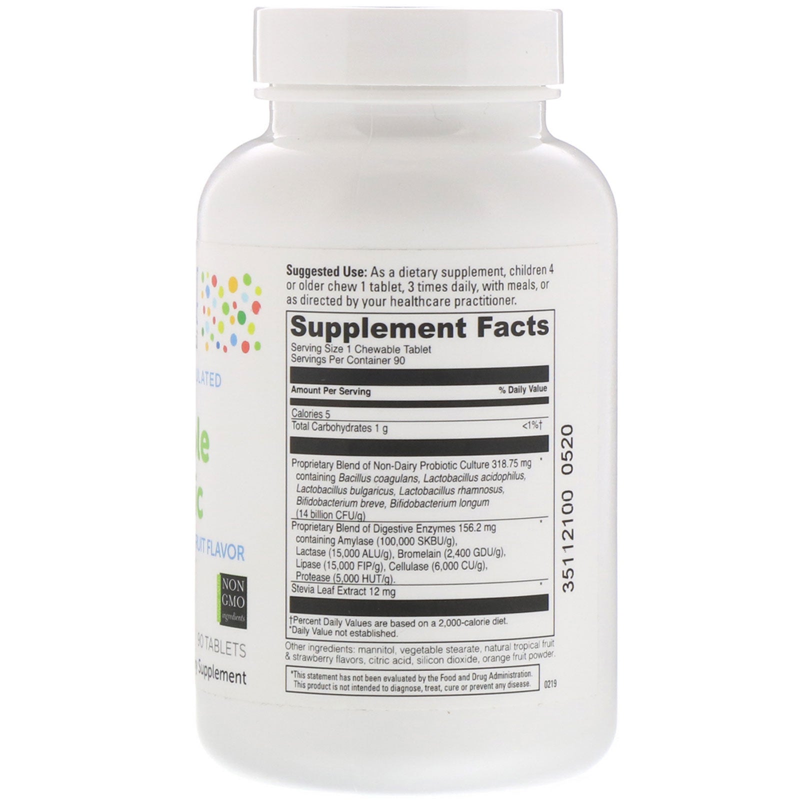 Doctor Formulated Healthy Digestion + Nutrient Absorption Made with Non GMO Ingredients Dietary Supplement Gluten Free Vegetarian No Artificial Dyes or Preservatives Little DaVinci offers doctor formulated supplements that enhance the health and well-being of kids using quality ingredients. Our tasty formulas are made in collaboration with top pediatric and nutritional experts, delivering high bioavailability with flavors kids love. Good health has never tasted so great.Sugg. UseAs a dietary supplement, children 4 or older chew 1 tablet, 3 times daily, with meals, or as directed by your healthcare practitioner.Other IngredientsMannitol, vegetable stearate, natural tropical fruit & strawberry flavors, citric acid, silicon dioxide, orange fruit powder.Supplement FactsServing Size: 1 Chewable Serving Per Container: 90 Amount Per Serving %Daily Value Calories 5 Total Carbohydrates 1 g <1%† Proprietary Blend of Non-Dairy Probiotic Culture containing Bacillus coagulans, Lactobacillus acidophillus, Lactobacillus bulgaricus, Lactobacillus rhamnosus, Bifidobacterium breve, Bifidobacterium longum (14 billion CFU/g) 318.75 mg *...