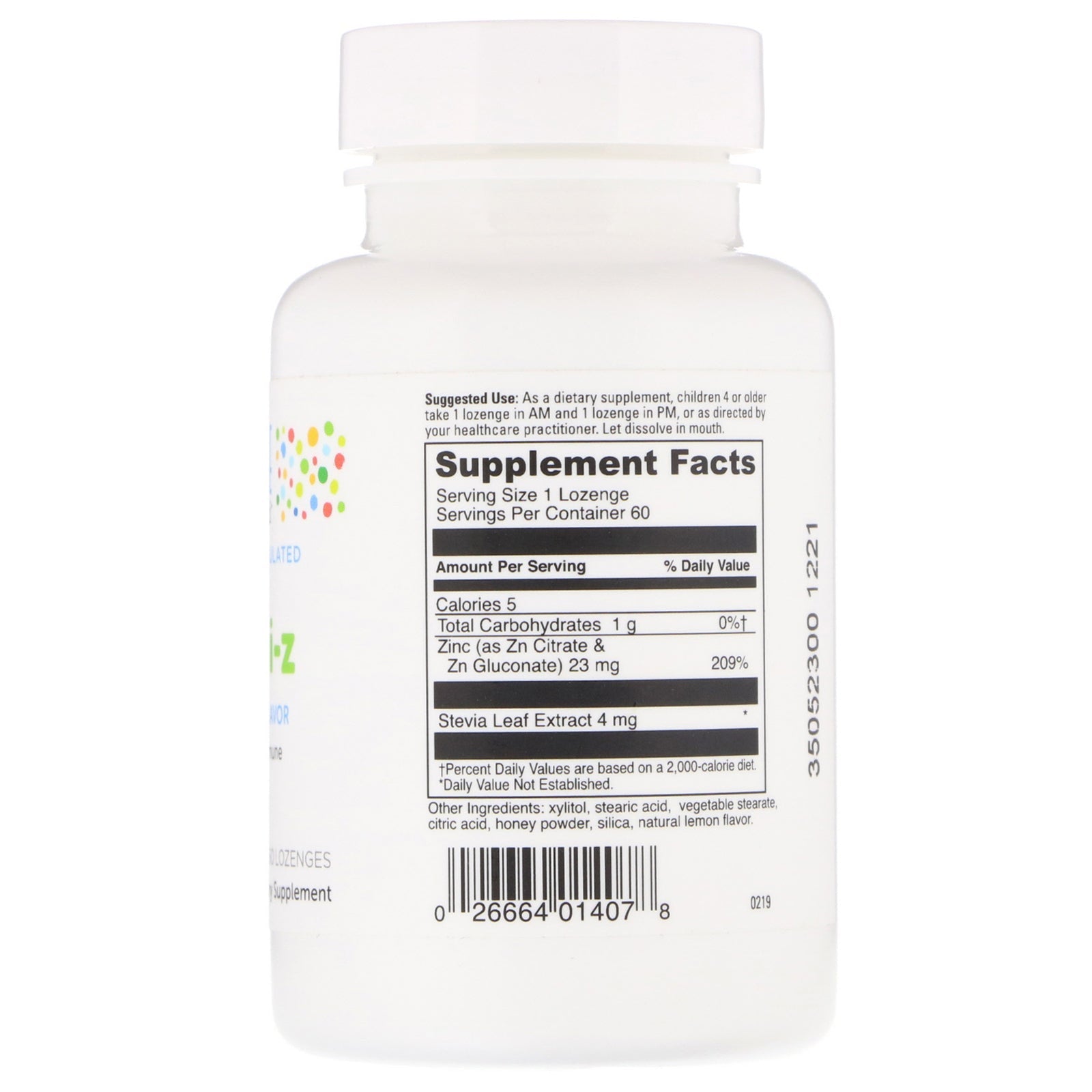 Doctor Formulated Promotes Healthy Immune System Function Dietary Supplement Gluten Free No Artificial Dyes or Preservatives Little DaVinci offers doctor formulated supplements that enhance the health and well-being of kinds using quality ingredients. Our tasty formulas are made in collaboration with top pediatric and nutritional experts, delivering high bio-availability with flavors kids love. Good health has never tasted so great.Sugg. UseAs a dietary supplement, children 4 or older take 1 lozenge in AM and 1 lozenge in PM, or as directed by your healthcare practitioner. Let dissolve in mouth.Other IngredientsXylitol, stearic acid, vegetable stearate, citric acid, honey powder, silica, natural lemon flavor.Supplement FactsServing Size: 1 Lozenge Serving Per Container: 60 Amount Per Serving %Daily Value Calories 5 Total Carbohydrates 1 g 0%† Zinc (as Zn Citrate &Zn Gluconate) 23 mg 209% Stevia Leaf Extract 4 mg * †Percent Daily Values are based on a 2,000 calorie diet. *Daily Value Not...