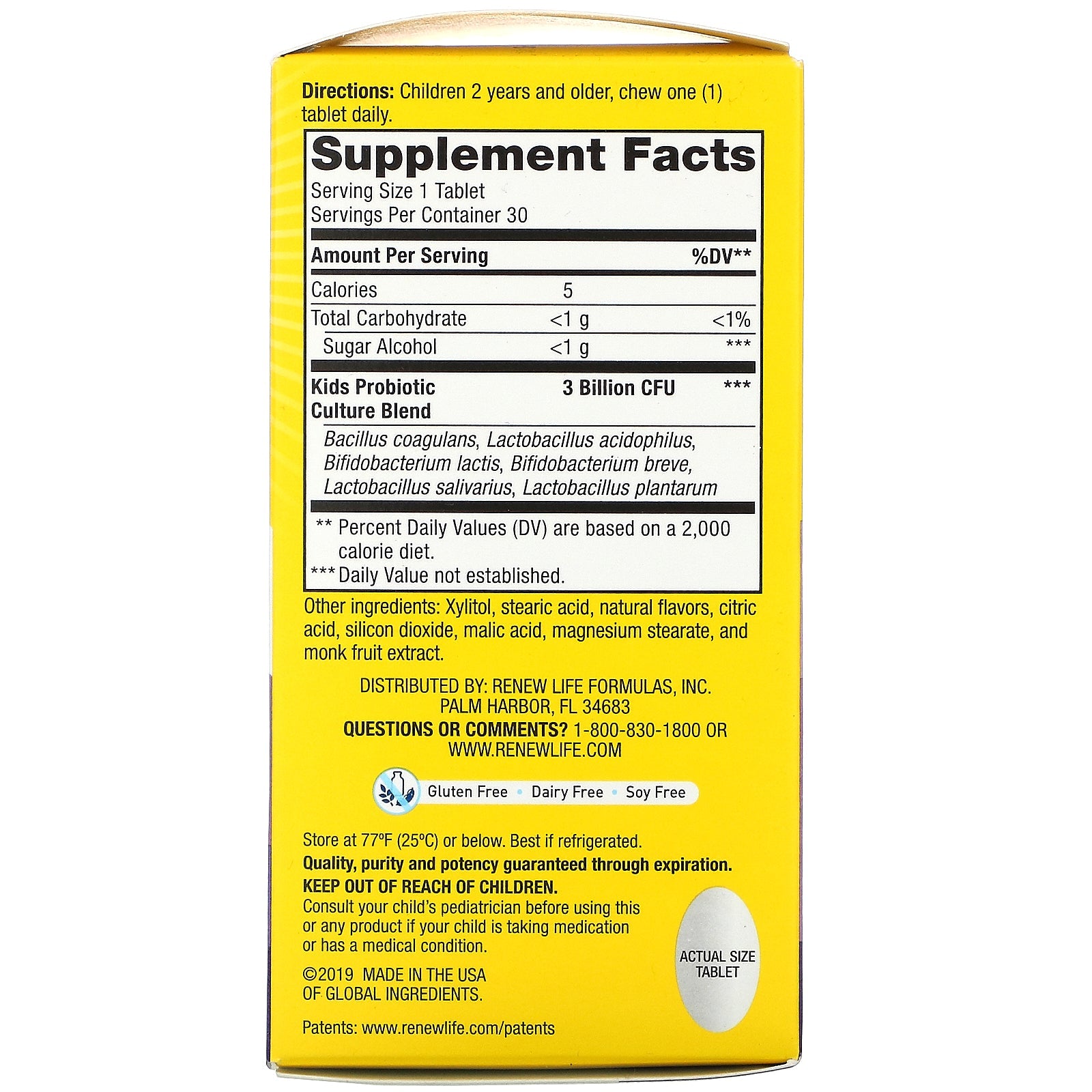 6 Probiotic Strains Helps Reduce Occasional Digestive Upsets Supports Kids' Immune Health Probiotic Supplement Free of Gluten, Dairy and Soy At Renew Life, we're probiotic pioneers with double decades of experience and innovation on our side to help keep your child's gut healthy and happy. Quality, purity and potency guaranteed through expiration. Contains a blend of 6 different strains to reflect the natural diversity of your child's gut. Great-tasting Berry-licious chewable tablet. Listen to your gut... you'll be glad you did. Did you know your child's gut is home to 70% of their immune system? It's also home to trillions of bacteria. And the environment, diet and even antibiotics can throw them out of balance. Renew Life® Ultimate Flora™ helps support digestive balance and harmony so your child's gut works smarter. Helping them feel healthier, happier and more energized to take on the day.Sugg. UseChildren 2 years and older, chew...