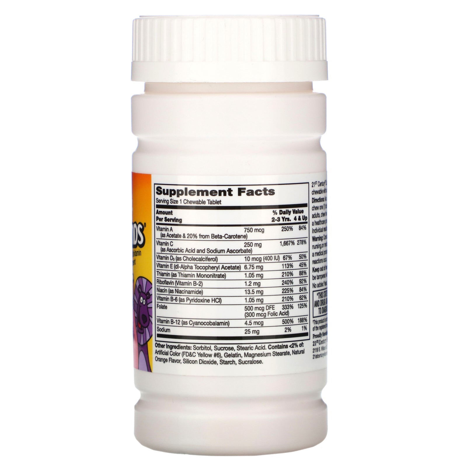 Children's Multivitamin Supplement Compare Vs. Flintstones™ Plus Immunity Support Guaranteed Quality - Laboratory Tested 21st Century® Zoo Friends® with Extra C is a children's multivitamin chewable with added vitamin C to support immune health.Sugg. UseAs a dietary supplement, children 2 to 3 years of age chew one (1) tablet daily; children 4 years and older and adults, chew two (2) tablets daily with any meal or as directed by a healthcare provider. Do not exceed recommended dosage. Individual results may vary.Other IngredientsSorbitol, sucrose, stearic acid. Contains <2% of: Artificial colors ( fd&c yellow #6), gelatin, magnesium stearate, natural orange flavor, silicon dioxide, starch, sucralose. No added yeast.Supplement FactsServing Size: 1 Chewable Tablet Amount Per Serving % Daily Value 2-3 Yrs. % Daily Value 4 & Up Vitamin A (as Acetate & 20% from Beta Carotene) 750 mcg 250% 84% Vitamin C (as Ascorbic Acid and Sodium Ascorbate) 250 mg 1,667%...