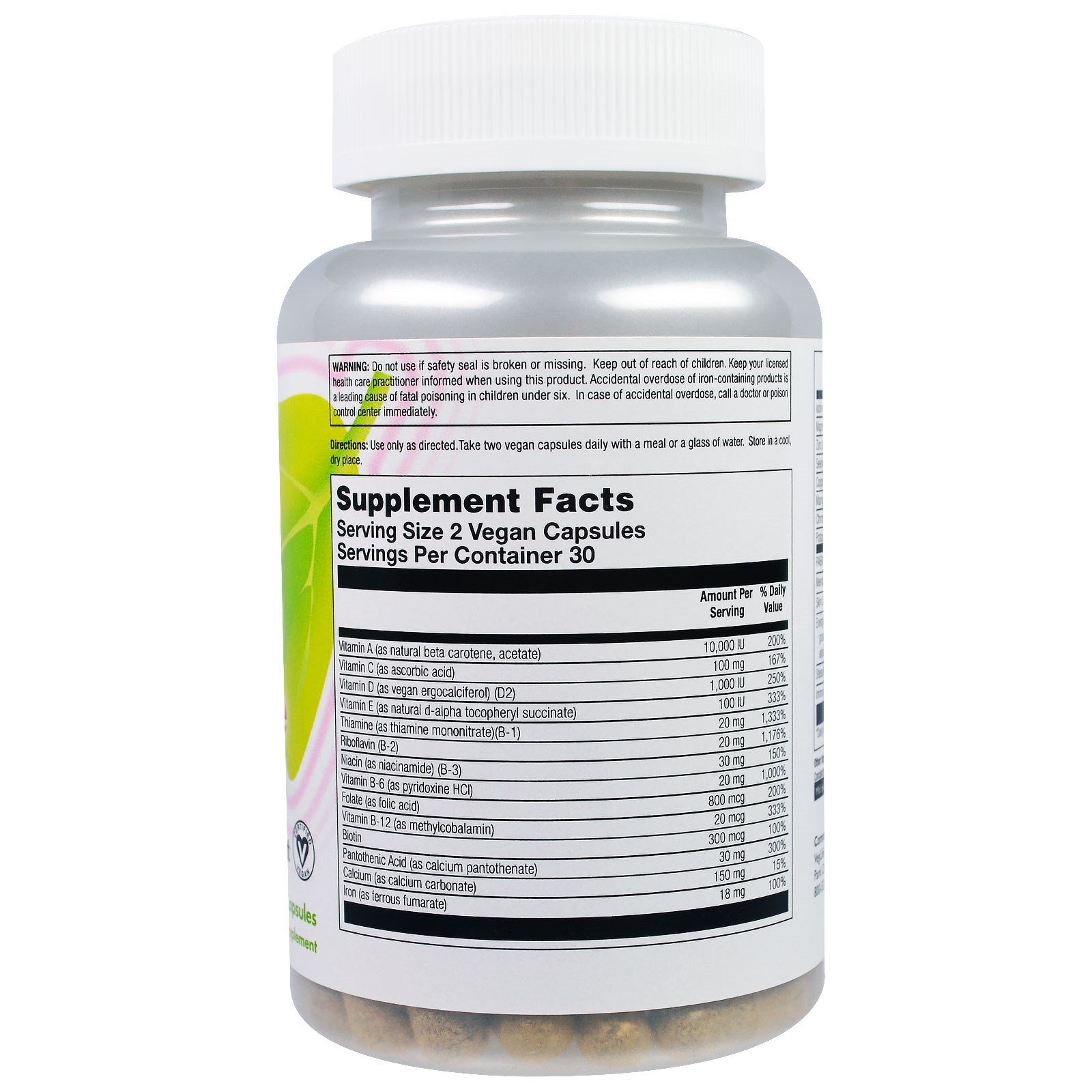 Serving Size: 2 Vegan Capsules Servings Per Container: 30 Amount Per Serving %Daily Value Vitamin A (as natural beta carotene, acetate) 10,000 IU 200% Vitamin C (as ascorbic acid) 100 mg 167% Vitamin D (as vegan ergocalciferol) (D2) 1,000 IU 250% Vitamin E (as natural d-alpha tocopheryl succinate) 100 IU 333% Thiamine (as Thiamine Mononitrate) (B-1) 20 mg 1,333% Riboflavin (B-2) 20 mg 1,176% Niacin (niacinamide) (B-3) 30 mg 150% Vitamin B-6 (as pyridoxine HCI) 20 mg 1,000% Folate (as folic acid) 800 mcg 200% Vitamin B-12 (as methylcobalamin) 20 mcg 333% Biotin 300 mcg 100% Pantothenic Acid (as calcium pantothenate) 30 mg 300% Calcium (as calcium carbonate) 150 mg 15% Iron (as ferrous fumarate) 18 mg 100% Iodine (as potassium iodide) 150 mcg 100% Magnesium (as magnesium oxide) 75 mg 19% Zinc (as zinc glycinate) 10 mg 67% Selenium (as selenomethionine) 100 mcg 143% Copper (as copper citrate) 1 mg 50% Manganese (as manganese glycinate) 1 mg 50% Chromium (as polynicotinate) 200 mcg 167% Potassium (as citrate) 5 mg <1% PABA (para-aminobenzoic acid) 5 mg * Mental Support Blend (ginkgo biloba extract, choline, inositol, GABA) 105 mg * Skin Support Blend [sea buckthorn (Hippophae rhamnoides) (fruit), MSM] 100 mg * Energy Foods & Digestive Support Blend (organic spirulina, organic barley grass, carrot, broccoli, tomato, aloe vera gel, bromelain, papain, amylase, alpha galactosidase) 50 mg * Stess/Mood Support Blend (chamomile), passionflower, lavender) 50 mg * Immune Support Blend (echinacea purpurea, reishi mushroom, elderyberry) 50 mg * *Daily Value not established.Disclaimer