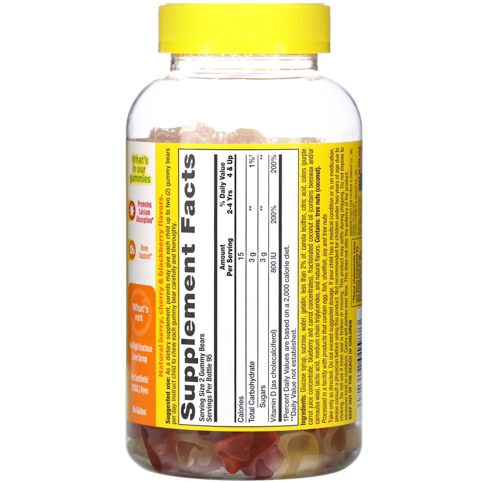 Powered by VitaFusion We Make Nutrition Taste Good Dietary Supplement Kid & Mom Approved Great Tasting! Natural Fruit Flavors Natural Berry, Cherry & Blackberry Flavors What's In Our Gummies: Promotes Calcium Absorption Bone Support What's Not: No High Fructose Corn Syrup No Synthetic (FD&C) Dyes No GlutenSugg. UseAs a dietary supplement, parents may give each child up to two (2) gummy bears per day. Instruct child to chew each gummy bear carefully and thoroughly.Other IngredientsGlucose syrup, sucrose, water, gelatin; less than 2% of: canola lecithin, citric acid, colors (purple carrot juice concentrate, blueberry and carrot concentrate), fractionated coconut oil (contains beeswax and/or carnauba wax), lactic acid, medium chain triglycerides, and natural flavors. Contains: Tree nuts (coconut). Processed in a facility with products that contain egg, fish, shellfish, soy and tree nuts.Supplement FactsServing Size: 2 Gummy Bears Serving Per Bottle: 95 Amount Per Serving %Daily Value 2-4 Yrs. %Daily Value 4...