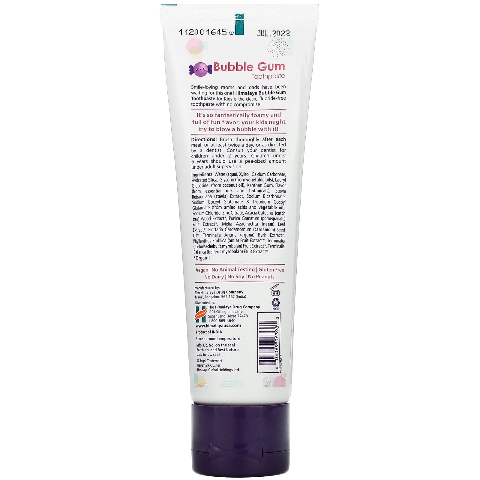 Bursting with Foam and Flavor! No Fluoride | SLS | Gluten | Artifical Colors or Flavors Vegan No Animal Testing No Dairy No Soy No Peanuts Smile-loving moms and dads have been waiting for this one! Himalaya Bubble Gum Toothpaste for Kids is the clean, fluoride-free toothpaste with no compromise! It's so fantastically foamy and full of fun flavor, your kids might try to blow a bubble with it!Sugg. UseBrush thoroughly after each meal, or at least twice a day, or as directed by a dentist. Consult your dentist for children under 2 years. Children under 6 years should use a pea-sized amount under adult supervision.Other IngredientsWater, xylitol, calcium carbonate, hydrated silica, glycerin (from vegetable oils), lauryl glucoside (from coconut oil), xanthan gum, flavor (from essential oils and botanicals), stevia rebaudiana (stevia) extract, sodium bicarbonate, sodium cocoyl glutamate & disodium cocoyl glutamate (from amino acids and vegetable oil), sodium chloride,...