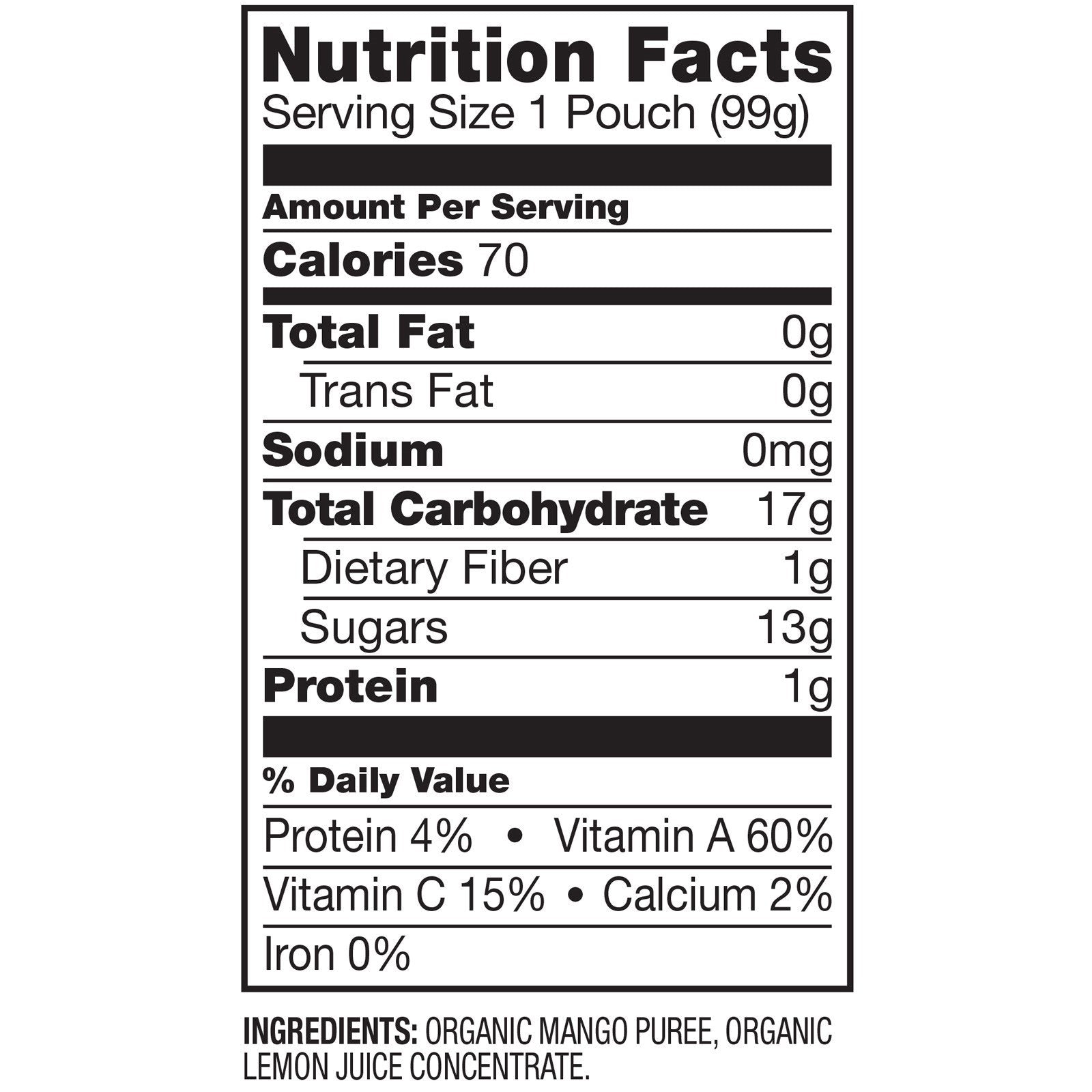 4 Months & Up USDA Non GMO Project Verified Non-BPA Packaging Certified B Corporation Certified by Oregon Tilth Amazing Deserves Amazing The greatest, most amazing people on the planet are babies - and we want to keep them that way. Let's set them on a course for a lifetime of healthy eating with nourishing ingredients, delightful flavors and vibrant colors to train their little palates. Feed amazing Nutrition - 60% DV Vitamin A, 15% DV Vitamin C Stage 1 - Simple purees & smooth texture-ages 4 mos. & up Palate - Train tiny taste buds from the very first bite Promise - Unsweetened, certified , no genetically modified ingredientsSugg. UseDo not microwave pouch. Refrigerate after opening & serve within 24 hours.Other Ingredients mango puree, lemon juice concentrate.Supplement FactsServing Size: 1 Pouch (99 g) Amount Per Serving %Daily Value Calories 70 Total Fat 0 g Trans Fat 0 g Sodium 0...