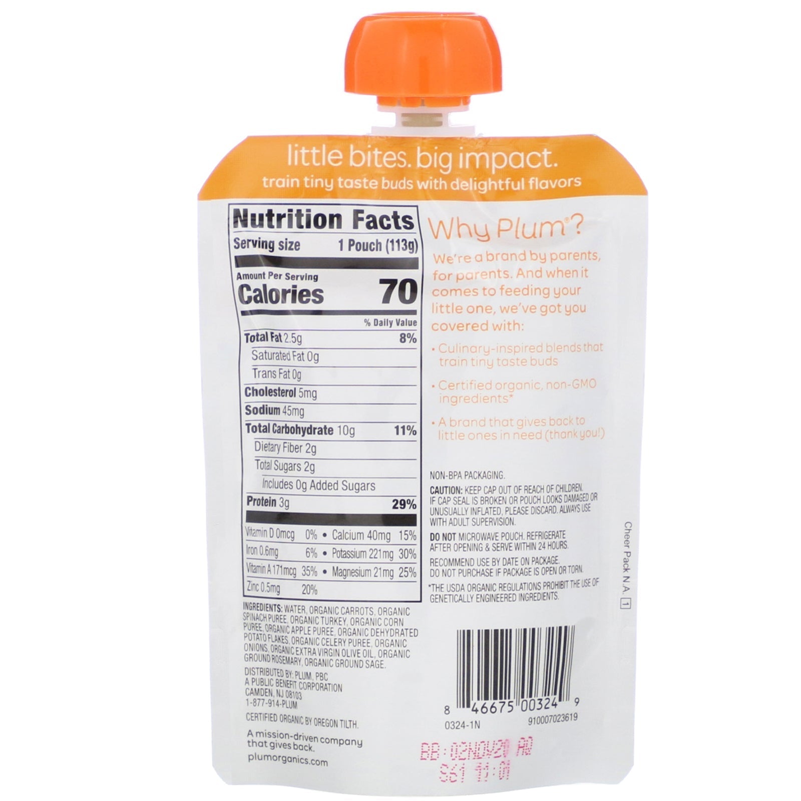 6 Months & Up 3g of Protein USDA Inspected for Wholesome by U.S Department of Agriculture P15893 Baby Food Clear Bottom Pouch Little Bites. Big Impact. Train Tiny Taste Buds with Delightful Flavors Non-BPA Packaging Certified by Oregon Tilth Why Plum®? We're a brand by parents, for parents. And when it comes to feeding your little one, we've got you covered with: Culinary-inspired blends that train tiny taste buds Certified , non-GMO ingredients* A brand that gives back to little ones in need (thank you!) *The USDA regulations prohibit the use of genetically engineered ingredients.Sugg. UseRefrigerate after opening & serve within 24 hours.Other IngredientsWater, carrots, spinach puree, turkey, corn puree, apple puree, dehydrated potato flakes, celery puree, onions, extra virgin olive oil, ground rosemary, ground sage.Supplement FactsServing Size: 1 Pouch (113 g) Amount Per Serving %Daily Value Calories 70 Total Fat 2.5 g 8% Saturated Fat 0 g Trans Fat...