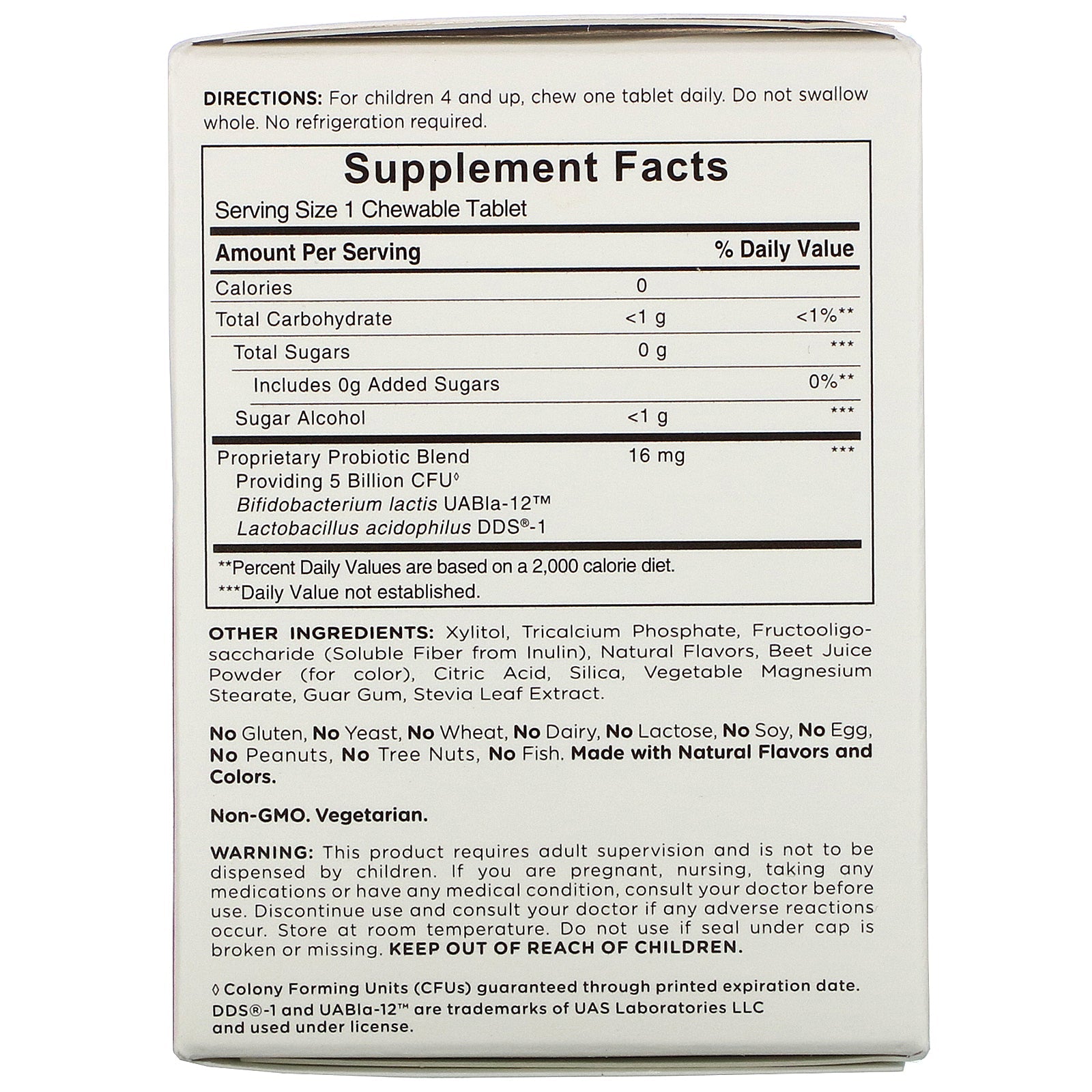 Serving Size: 1 Chewable Tablet Amount Per Serving: %DV Calories 0 Total Carbohydrate <1 g <1%** Total Sugars 0 g *** Includes 0 g Added Sugars 0%** Sugar Alcohol <1 g *** Proprietary Probiotic Blend Providing 5 Billion CFU Bifidobacterium lactis UABla-12 ™ Lactobacillus acidophilus DDS ® -1 16 mg *** **Percent Daily Values based on a 2,000 calorie diet. ***Daily Value not established.