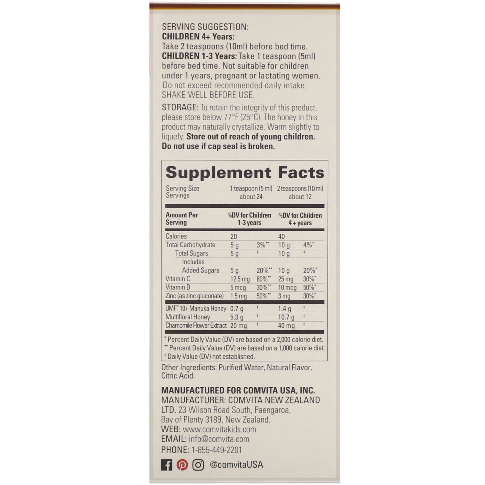 Serving Size: 1 teaspoon (5 ml) / 2 teaspoons (10 ml) Serving Per Container: about 24/ about 12 Amount Per Serving %DV for Children 1-3 Years Amount Per Serving %DV for Children 4+ Years Calories 20 40 Total Carbohydrate 5 g 3%** 10 g 4%* Total Sugars 5 g ‡ 10 g ‡ Includes Added Sugars 5 g 20%** 10 g 20%* Vitamin C 12.5 mg 80%** 25 mg 30%* Vitamin D 5 mcg 30%** 10 mcg 50%* Zinc (as zinc gluconate) 1.5 mg 50%** 3 mg 30%* UMF™ 10+ Manuka Honey 0.7 g ‡ 1.4 g ‡ Multifloral Honey 5.3 g ‡ 10.7 g ‡ Chamomile Flower Extract 20 mg ‡ 40 mg ‡ *Percent Daily Values (DV) are based on a 2,000 calorie diet. **Percent Daily Values (DV) are based on a 1,000 calorie diet. ‡Daily Value (DV) not established.Disclaimer