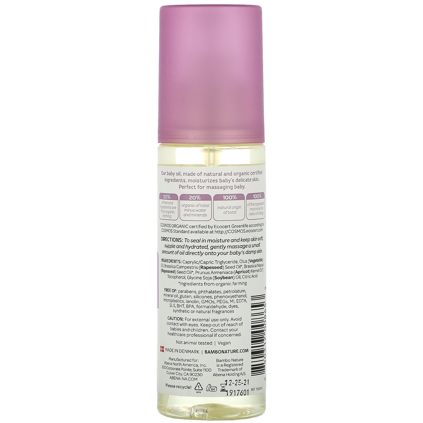 For The Love of Babies, Bees, Birds & Trees® Natural & Organic Certified No Added Fragrances, Dyes, or Parabens Gentle on Your Baby's Skin Asthma Allergy Nordic Selected with Care EcoCert® Cosmos Organic Nordic Swan Ecolabel Not Animal Tested Vegan Non-GMO Our baby oil, made of natural and organic certified ingredients, moisturizers baby's delicate skin. Perfect for massaging baby. 20% of the total ingredients are from organic farming 20% Organic of total minus water and minerals 100% Natural origin of total 100% Of the ingredients minimize the risks of allergy Cosmos Organic certified by Ecocert Greenlife according to Cosmos standard.Sugg. UseTo seal in moisture and keep skin soft, supple and hydrated, gently massage a small amount of oil directly onto your baby's damp skin.Other IngredientsCaprylic/capric triglyceride, olus (vegetable) oil, brassica campestris (rapeseed) seed oil*, brassica napus (rapeseed) seed oil*, prunus armeniaca (apricot) kernel oil*, tocopherol, glycine soja (soybean) oil, citric...