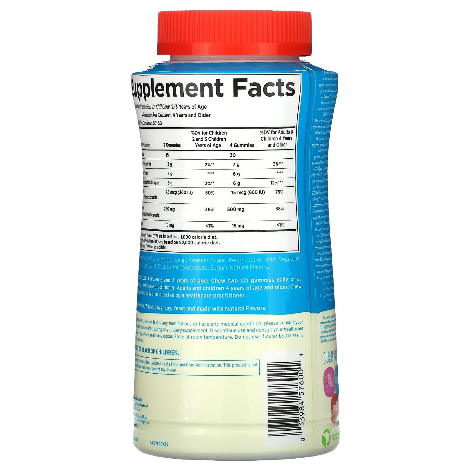 Since 1947 Fun to Eat! Moms Meet Approved Non-GMO Supports Bone Health Made with Naturally Sourced Colors and Flavors Gluten, Wheat & Dairy Free Dietary Supplement 3 Great Flavors- Pink Lemonade- Blueberry- Strawberry Solgar® has been crafting nutritional supplements for generations—over 65 years. And just like all of our supplements, U-Cubes™ Calcium with D3 Gummies benefit from the extensive science and knowledge behind our name. These beneficial gummies can be taken alone or in combination with Solgar U-Cubes™ Multivitamin Gummies. Each serving of tapioca-based U-Cubes™ Calcium with D3 provides the pediatrician-recommended dosage of Vitamin D3¹, [15 mcg] [600 IU] per 4 gummies, which offers 75% DV for children 4 years and older and [7.5 mcg] [300 IU] per 2 gummies, which offers 50% DV for children 2 and 3 years of age. Vitamin D3 assists in the absorption of calcium to promote healthy bones and teeth. It also supports immune-system health. U-Cubes™ Calcium With D3 Gummies are made the Solgar way. That means that they're crafted in small batches to help ensure the highest quality. They're also non-GMO plus rigorously tested for safety and potency...but never animal tested. The result? A great-tasting gummy that U can be sure is great for your children. ¹The American Academy of Pediatrics recommends children and adolescents receive [15 mcg] [600 IU] of Vitamin D per day. These gummies provide [15 mcg] [600 IU] per 4 gummies for children 4 and up and [7.5 mcg] [300 IU] per 2 gummies for children 2 to 3.