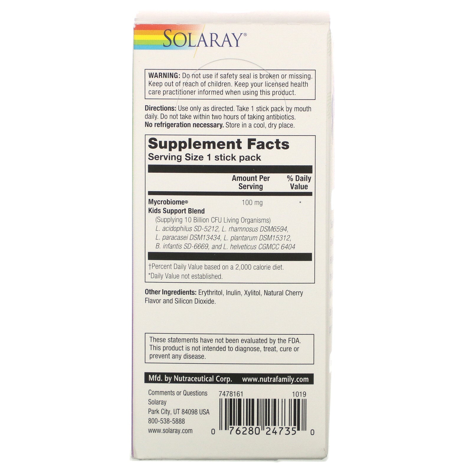 6 Strains + Prebiotic Inulin Vegan Non-GMO Gluten/Soy Free Once Daily Dietary Supplement Designed for kids From birth to adulthood, the one constant in human development is change. All systems of a child's body develop at an astounding pace. This constant change defines who we are, and shapes our future. A balanced microbiome is an essential component for normal, healthy progress toward adulthood. Packed with key probiotic strains Mycrobiome® Kids Formula is designed to support a healthy balanced microbiome through all stages of development. Probiotics for kids Healthy Immune System Digestive Function Mood and Stress Support Mental Clarity Healthy Development Direct-to-mouth Solaray® Mycrobiome® Kids Immune Formula Probiotic comes in an easy-to-take stick pack. Kids will love the delicious cherry flavor, moms will love knowing their kids are balancing their microbiome with a sugar free punch of probiotics. rip.pour.swallow. GO!Sugg. UseUse only as directed. Take 1 stick pack by mouth daily....
