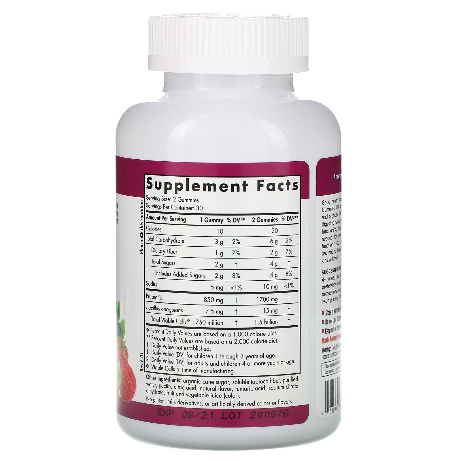 Optimal Digestion Intestinal Health Healthy Immunity No Refrigeration Needed 1.5 Billion Live Cultures With Prebiotic Dietary Fiber Non-GMO Verified Third-Party Purity Tested Dietary Supplement Synergistic Vegetarian Formula Good health starts in the gut. Nordic Naturals Probiotic Gummies KIDS provides a synergistic blend of probiotics, and prebiotic fiber, to help establish and maintain healthy digestive balance. When a child's digestive tract is properly functioning, it can better absorb and utilize the nutrients needed for growth, development, and strong immune function. Our unique probiotic formula allows good bacteria to flourish. These are great-tasting gummies your kids will love!Sugg. UseFor 2-4 years, one gummy daily. For 4+ years, two gummies daily. Take right before a meal, preferably breakfast, or as directed by your health care professional or pharmacist. Please ensure child chews each gummy thoroughly.Other IngredientsOrganic cane sugar, purified water, pectin, citric acid, natural flavor, sodium citrate, fruit and vegetable juice (for color)....