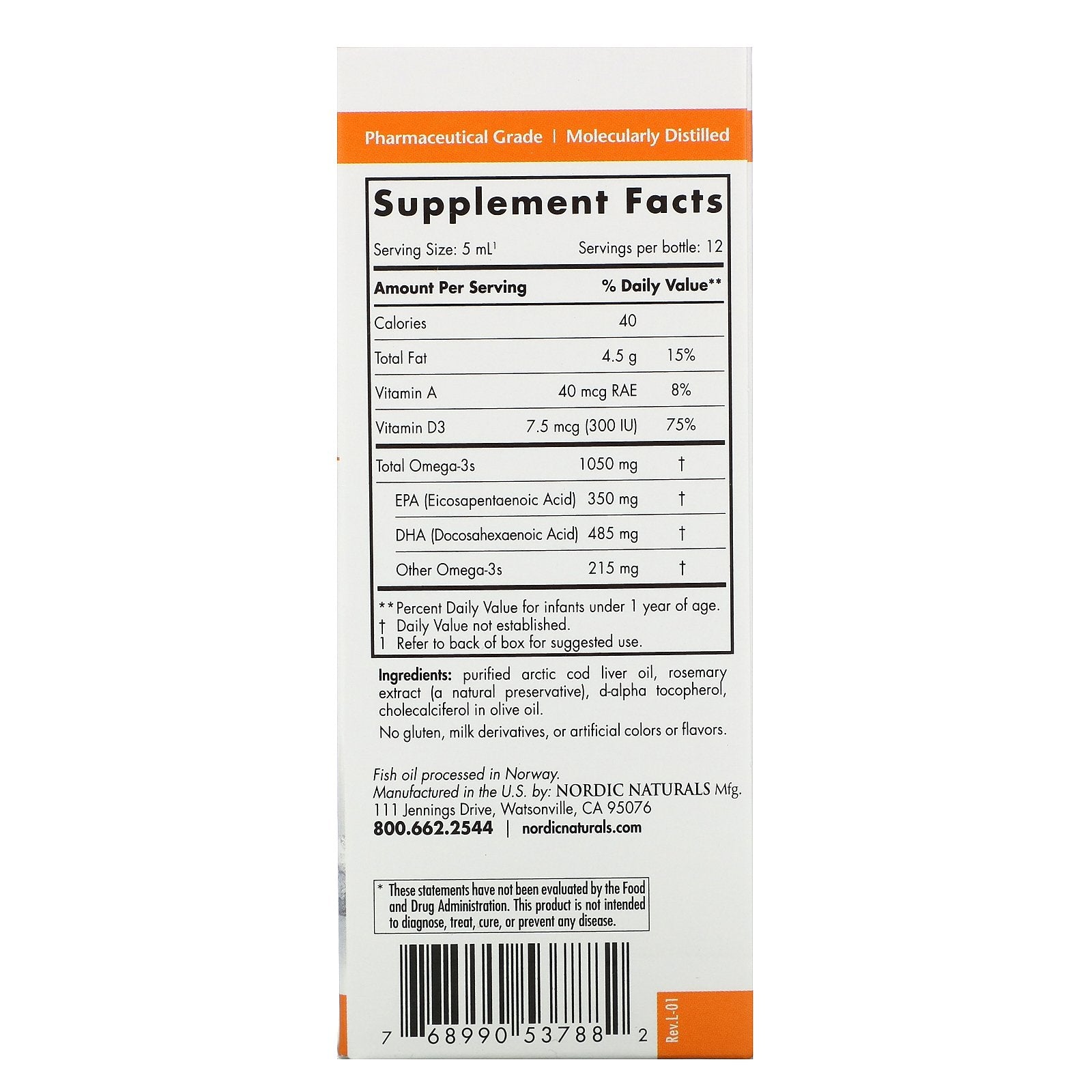 Serving Size: 5 ml¹ Serving Per Container: 12 Amount Per Serving % Daily Value** Calories 40 Total Fat 4.5 g 15% Vitamin A 40 mcg (RAE) 8% Vitamin D3 7.5 mcg (300 IU) 75% Total Omega-3s 1050 mg † EPA (Eicosapentaenoic Acid) 350 mg † DHA (Docosahexaenoic Acid) 485 mg † Other Omega-3s 215 mg † **Percent Daily Value for infants under 1 year of age. † Daily Value not established. ¹ Refer to back of box for suggested use.Disclaimer