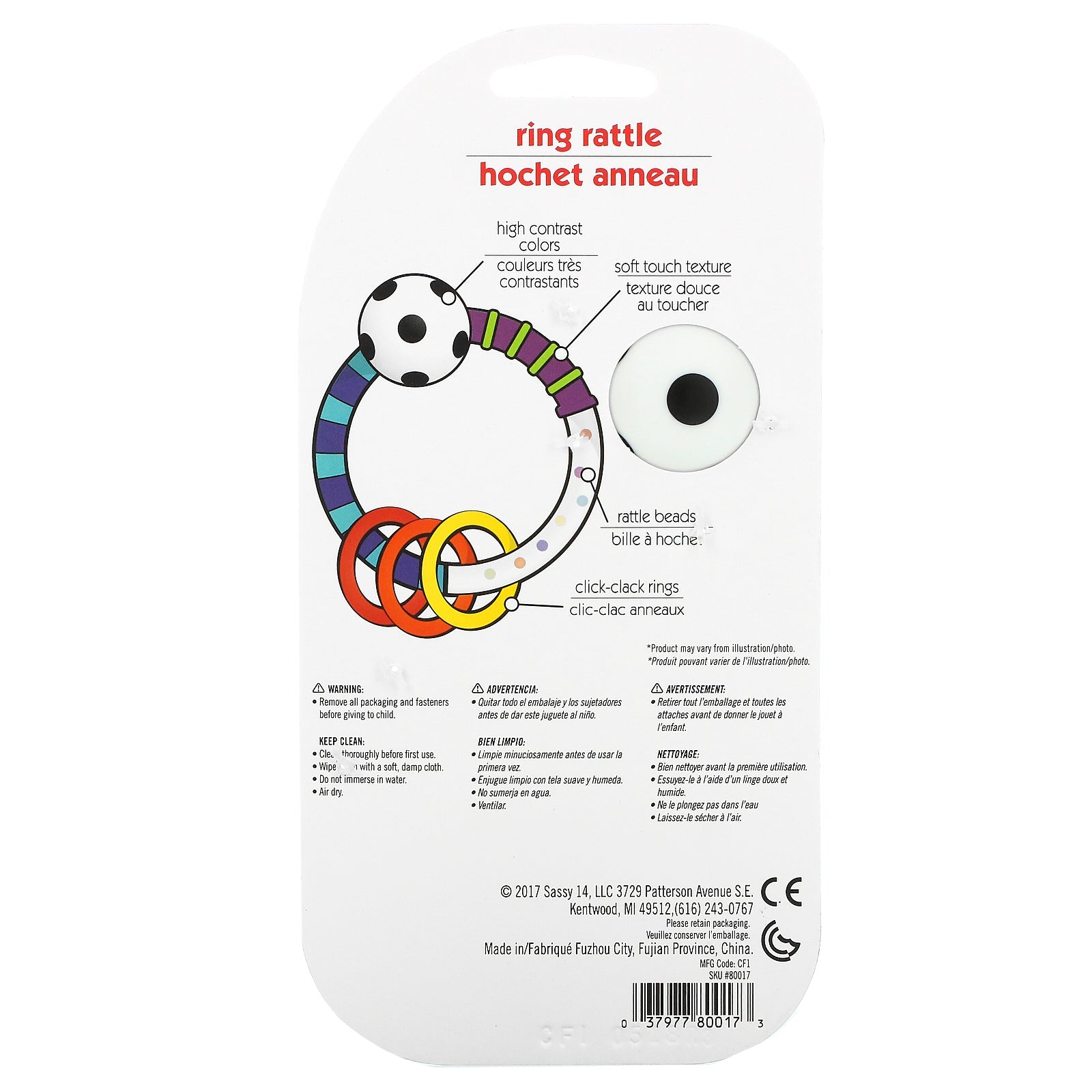 Encourages Motor Skills High Contrast Colors Soft Touch Texture Rattle Beads Click-Clack RingsSugg. UseKeep clean: Clean thoroughly before first use. Wipe clean with a soft, damp cloth. Do not immerse in water. Air dry.Other IngredientsSupplement FactsDisclaimerWhile VitaminsUK strives to ensure the accuracy of its product images and information, some manufacturing changes to packaging and/or ingredients may be pending update on our site. Although items may occasionally ship with alternate packaging, freshness is always guaranteed. We recommend that you read labels, warnings and directions of all products before use and not rely solely on the information provided by VitaminsUK.