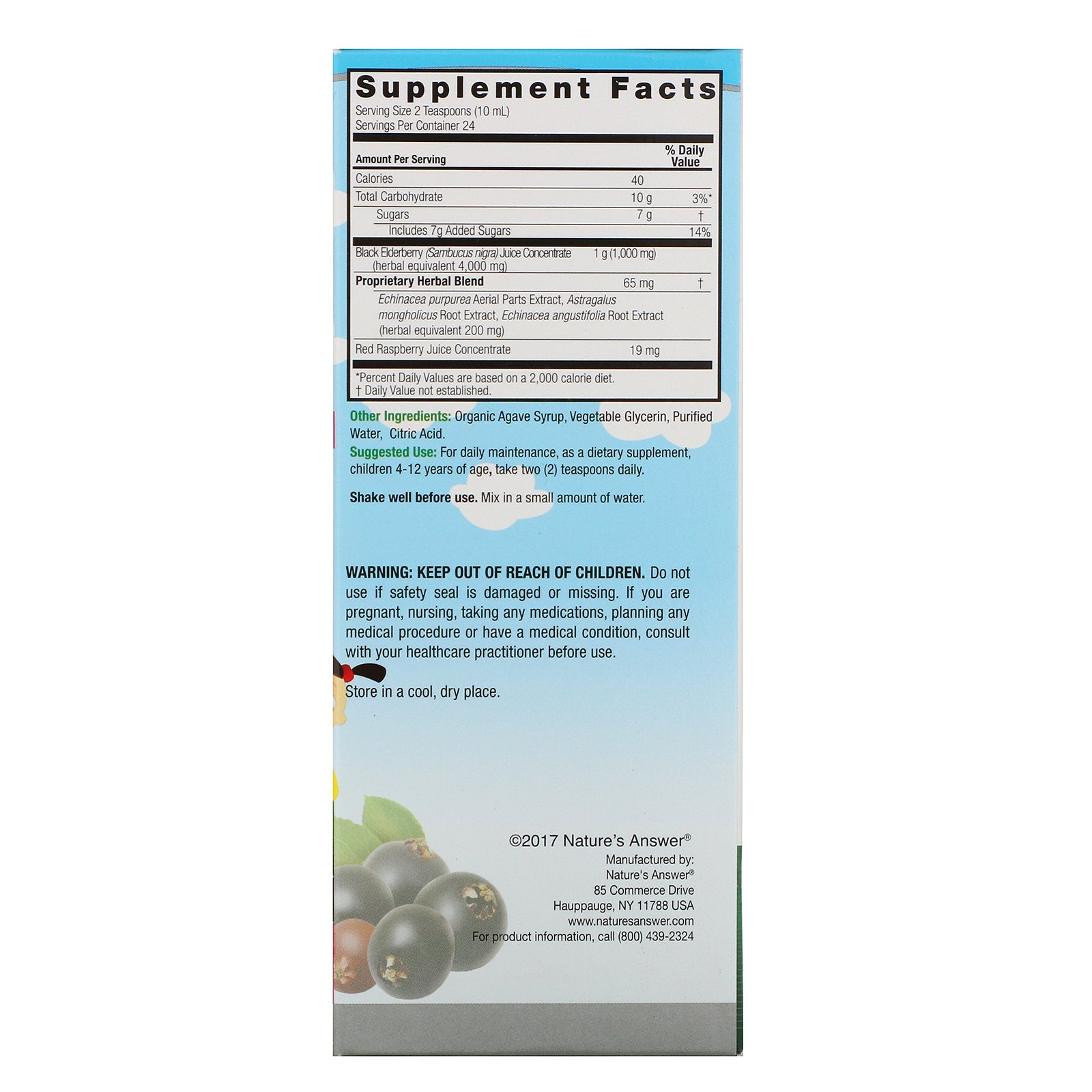 Serving Size: 2 Teaspoons (10 ml) Servings Per Container: 24 Amount Per Serving %Daily Value Calories 40 Total Carbohydrate 10 g 3%* Sugars Includes 7 g Added Sugars 7 g † 14% Black Elderberry (Sambucus nigra) Juice Concentrate Extract (herbal equivalent 4,000 mg) 1 g (1,000 mg) Proprietary Herbal Blend 65 mg † Echinacea purpure Aerial Parts Extract, Astragalus mongholicus Root Extract, Echinacea angustifolia Root Extract (herbal equivalent 200 mg) Red Raspberry Juice Concentrate 19 mg *Percent Daily Values are based on a 2,000 calorie diet. †Daily Values not established.Disclaimer