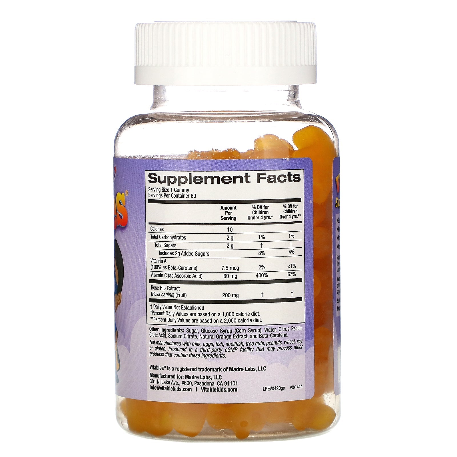 Vitables Gummy Vitamin C For Children Super Gummies for Superheroes! Featuring Vitamin C & Rose Hips Orange Flavor 60 Vegetarian Gummies Gelatin Free & Made with Citrus Pectin No Animal Products & No Artificial Colors or Sweeteners cGMP Manufactured & Quality Confirmed Vitables are a fun, tasty way to help keep your kids healthy. Gummy Vitables Vitamin C For Children are gummies that feature Vitamin C and Rose Hips, are Gelatin-Free and made with Citrus Pectin. iHerb Blog: A Pediatrician’s Guide to Vitamins Nutrition for Your Child and When to Supplement iTested VerifiedSugg. UseAs a dietary supplement for children ages 4 and over, chew 1 gummy daily. For use by children under age 4, seek the advice of a pediatrician.Other IngredientsSugar, Glucose Syrup (Corn Syrup), Water, Citrus Pectin, Citric Acid, Sodium Citrate, Natural Orange Extract, and Beta-Carotene. Not manufactured with milk, eggs, fish, shellfish, tree nuts, peanuts, wheat, soy...