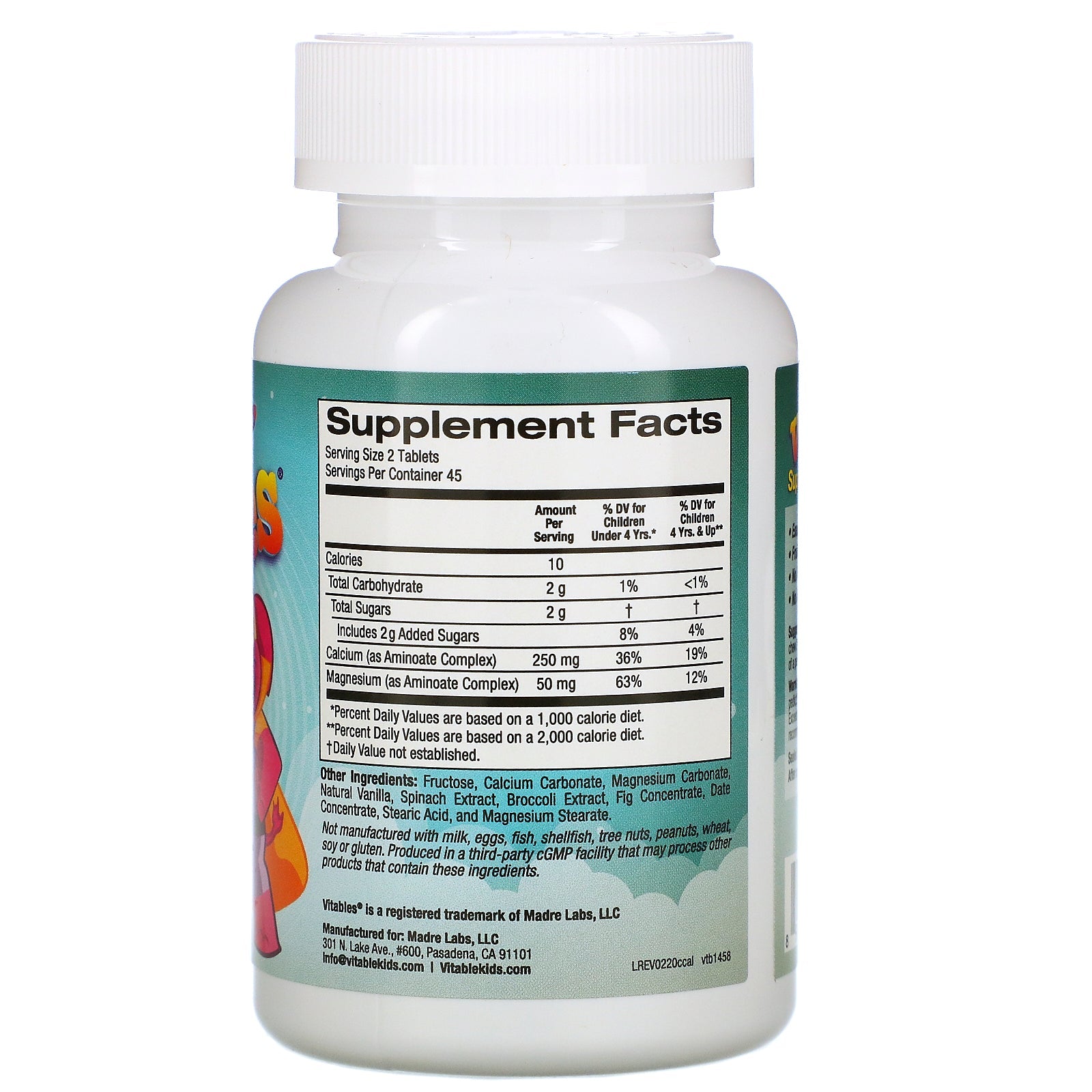 Serving Size: 2 Tablets Servings Per Container: 45 Amount Per Serving %Daily Value for Children 1 through 3 Years of Age %Daily Value for Adults and Children 4 or more Years of Age Calories 10 Total Carbohydrate 2 g 1%** < 1%* Total Sugars 2 g † † Includes 2 g Added Sugars 8%** 4%* Calcium (as aminoate complex) 250 mg 36% 19% Magnesium (as aminoate complex) 50 mg 63% 12% *Percent Daily Values are based on a 2,000 calorie diet. **Percent Daily Values are based on a 1,000 calorie diet. †Daily Value not established.Disclaimer