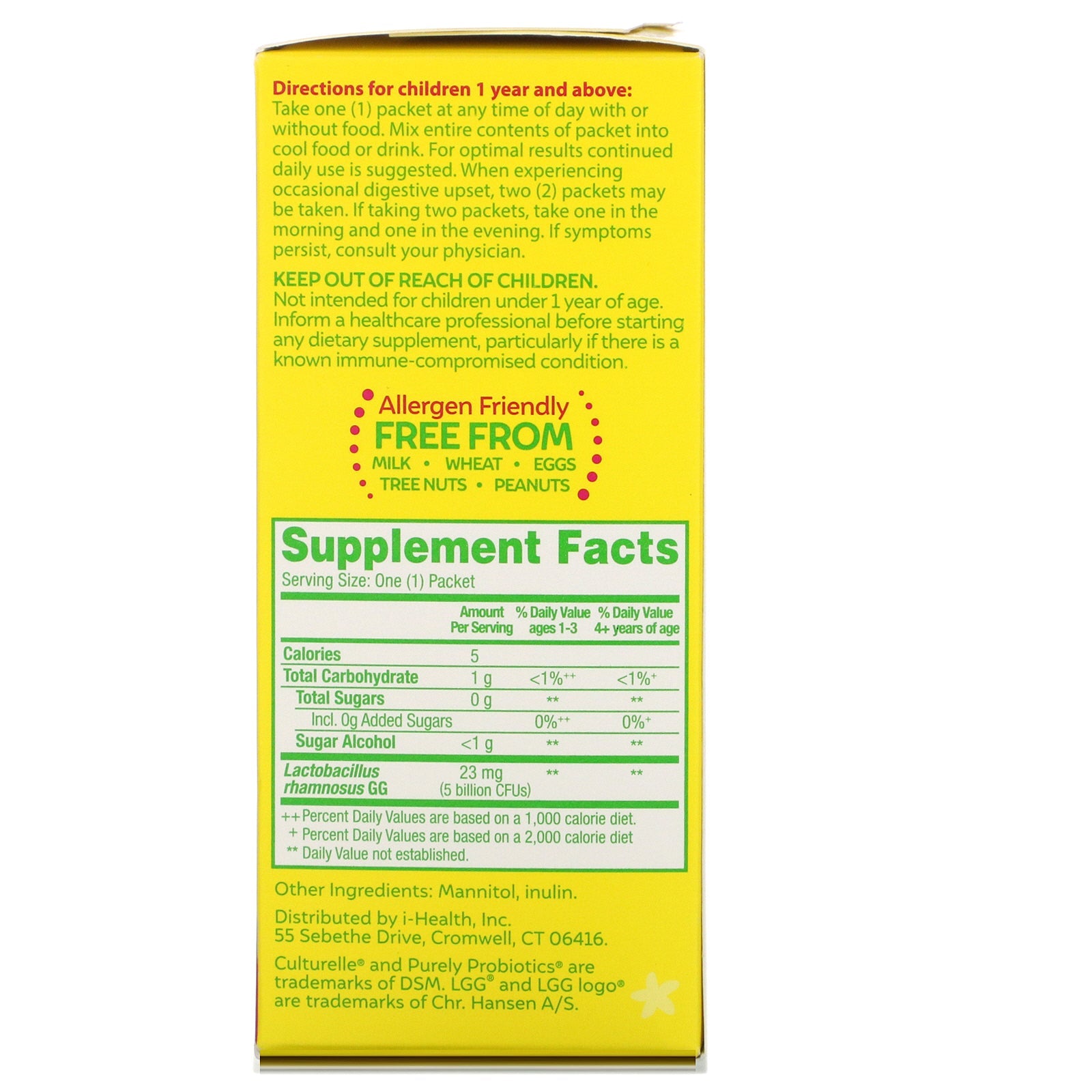 Serving Size: One (1) Packet Amount Per Serving %Daily Value ages 1-3 %Daily Value 4+ years of age Calories 5 Total Carbohydrate 1 g < 1%++ < 1%* Total Sugars 0 g ** ** Incl. 0 g Added Sugars 0%** 0%* Sugar Alcohol < 1 g ** ** Lactobacillus rhamnosus GG 23 mg 5 billion CFUs ** ** ++Percent Daily Values are based on a 1,000 calorie diet. +Percent Daily Values are based on a 2,000 calorie diet. † Daily Value not established.Disclaimer