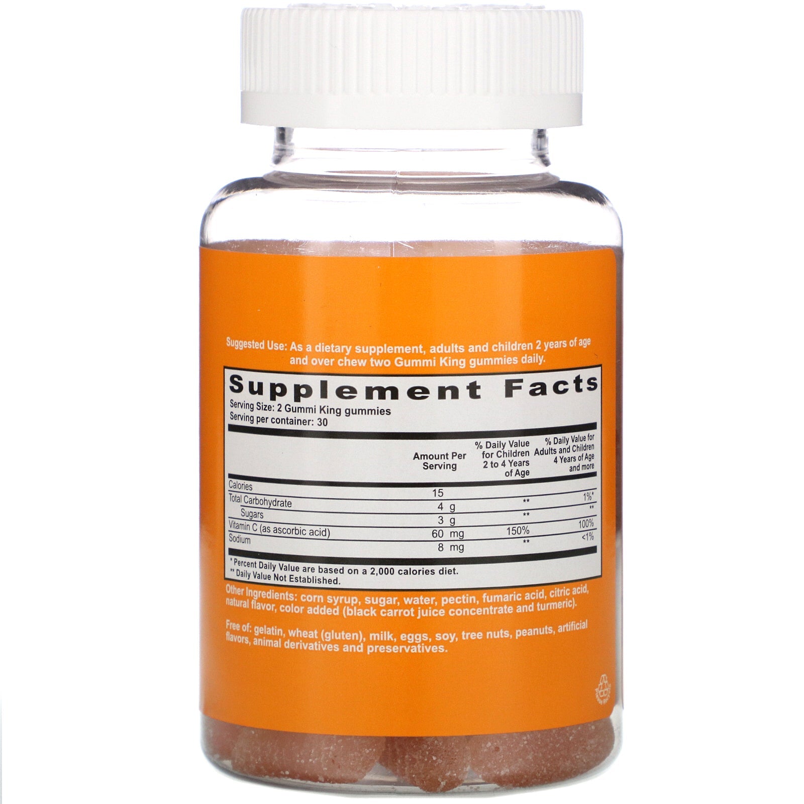 Antioxidant + Immune Health Gelatin Free Natural Flavors Gluten Free Dietary Supplement Certified Vegan According to Vegan ActionSugg. UseAs a dietary supplement, adults and children 2 years of age and over chew two Gummi King gummies daily.Other IngredientsCorn syrup, sugar, water, pectin, fumaric acid, citric acid, natural flavor, color added (black carrot juice concentrate and turmeric). Free of : Gelatin, wheat (gluten), milk, eggs, soy, tree nuts, peanuts, artificial flavors, animal derivatives and preservatives.Supplement FactsServing Size: 2 Gummi King Gummies Servings Per Container: 30 Amount Per Serving %Daily Value for Children 2 to 4 Years of Age %Daily Value for Adults and Children 4 Years of Age and more Calories 15 Total Carbohydrate 4 g ** 1%* Sugars 3 g ** ** Vitamin C (as ascorbic acid) 60 mg 150% 100% Sodium 8 mg ** <1% * Percent Daily Value are based on a 2,000 calories diet. ** Daily Value...