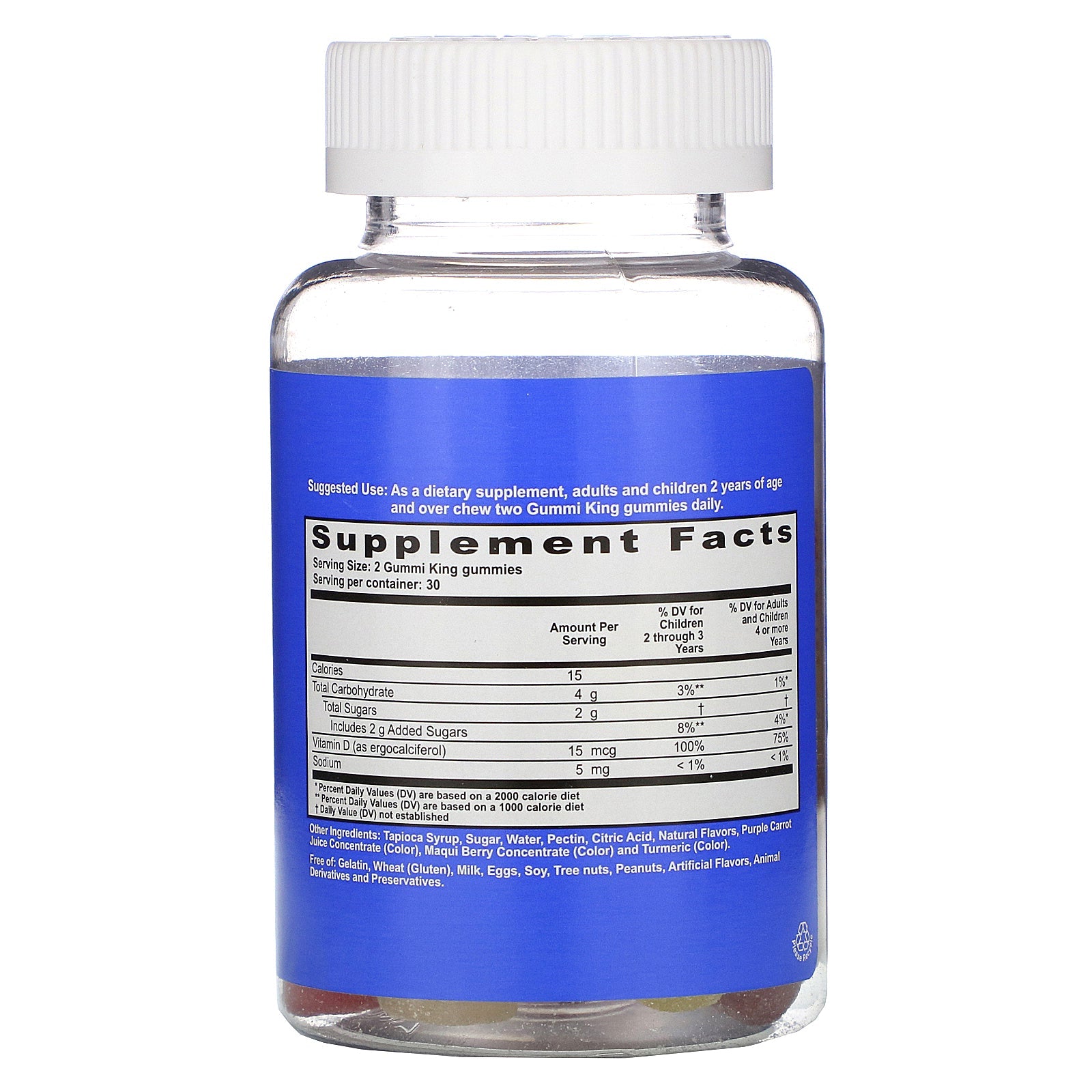 Calcium Absorption + Bone Health Vegan Gelatin Free Natural Flavors Gluten Free Dietary Supplement Certified Vegan According to Vegan Action Natural and Delicious Flavors Strawberry, Orange, Lemon, Grape, Cherry and GrapefruitSugg. UseAs a dietary supplement, adults and children 2 years of age and over chew two Gummi King gummies daily.Other IngredientsTapioca syrup, sugar, water, pectin, citric acid, natural flavors, purple carrot juice concentrate (color), maqui berry concentrate (color) and turmeric (color). Free of: Gelatin, wheat (gluten), milk, eggs, soy, tree nuts, peanuts, artificial flavors, animal derivatives and preservatives.Supplement FactsServing Size: 2 Gummi King gummies Servings Per Container: 30 Amount per Serving % Daily Value for Children 2 through 3 Years % Daily Value for Adults and Children 4 or more Years Calories 15 Total Carbohydrate 4 g 3%** 1%* Total Sugars 2 g † † Includes 2 g Added Sugars 8%** 4%* Vitamin D (as ergocalciferol) 15 mcg 100% 75%...