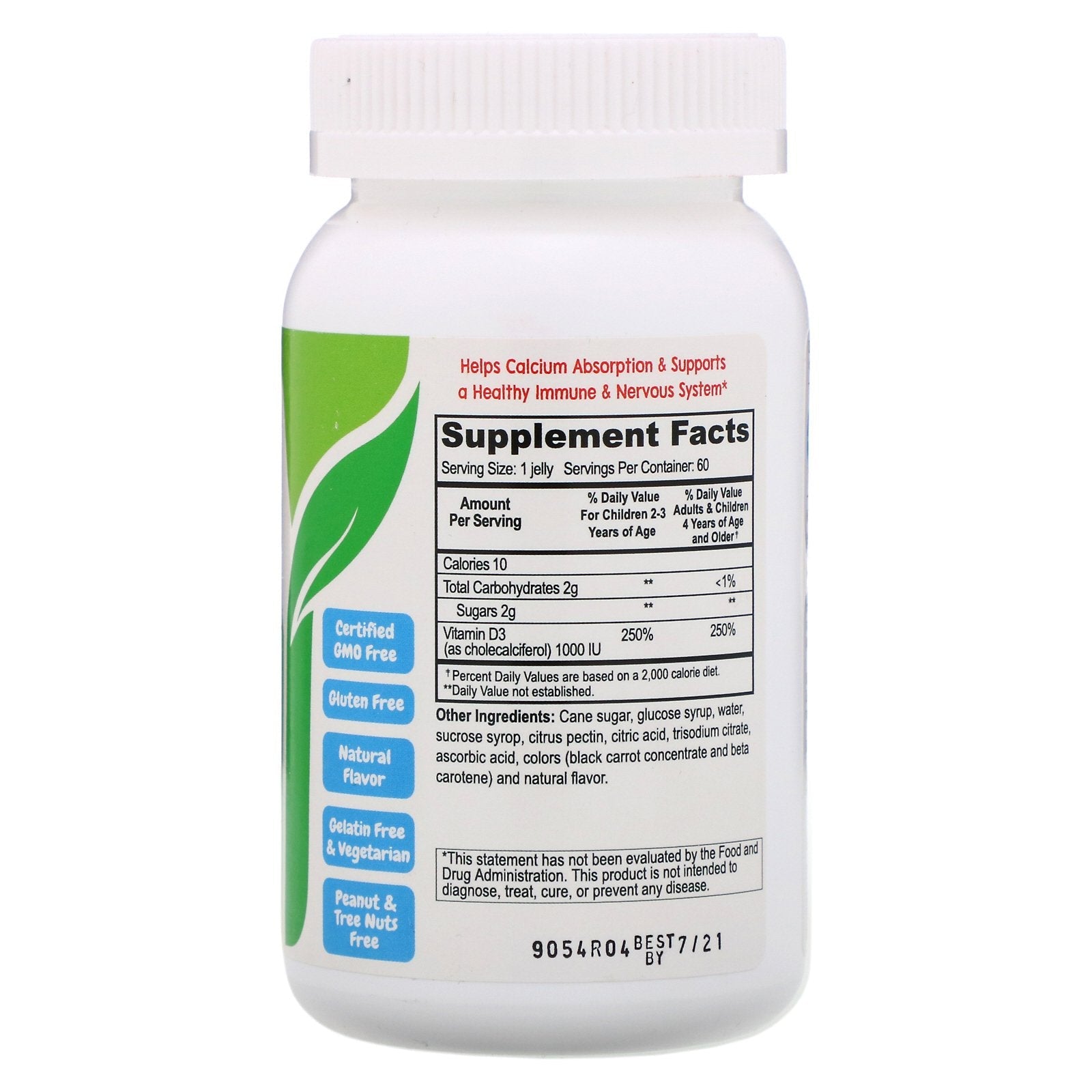 Pure 1000 IU Per Serving Tooth Friendly Dietary Supplement Kosher Certified GMO Free Gluten Free Natural Flavor Gelatin Free & Vegetarian Peanut & Tree Nuts Free Helps Calcium Absorption & Supports a Healthy Immune & Nervous System YumVs Jellies pack a powerful nutritional punch in a great tasting jelly form. Chewy gelatin or pectin gummies stick to your teeth and may cause cavities. Our jellies are softer than gummies and less sticky.Sugg. UseAs a dietary supplement, take one (1) jelly per day. Chew thoroughly before swallowing.Other IngredientsCane sugar, glucose syrup, water, sucrose syrup, citrus pectin, citric acid, trisodium citrate, ascorbic acid, colors (black carrot concentrate and beta carotene) and natural flavor. Does not contain eggs, wheat (gluten), milk, peanuts, tree nuts, soy, fish or shellfish. Produced in a nut free facility.Supplement FactsServing Size: 1 jelly Serving Per Container: 60 Amount Per Serving %Daily Value For Children 2-3 Years of Age...