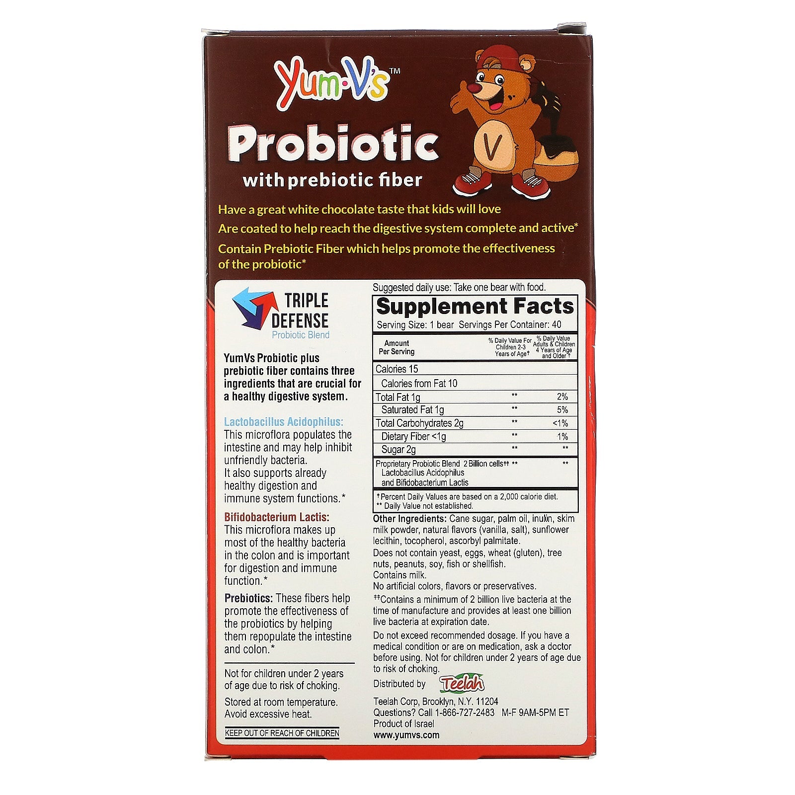 Triple Defense Probiotic Blend Helps to Restore Digestive Health Natural Flavors Dietary Supplement Kosher Dairy Immune System Helps Digest Food Non GMO Gluten Free Natural Flavors Have a Great White Chocolate Taste That Kids Will Love Are Coated To Help Reach the Digestive System Complete and Active Contain Prebiotic Fiber Which Helps Promote the Effectiveness of the Probiotic YumVs Probiotic plus prebiotic fiber contains three ingredients that are crucial for a healthy digestive system. Lactobacillus Acidophilus : This microflora populates the intestine and may help inhibit unfriendly bacteria. It also supports already healthy digestion and immune system functions. Bifidobacterium Lactis : This microflora makes up most of the healthy bacteria in the colon and is important for digestion and immune function. Prebiotics : These fibers help promote the effectiveness of the probiotics by helping them repopulate the intestine and colon.