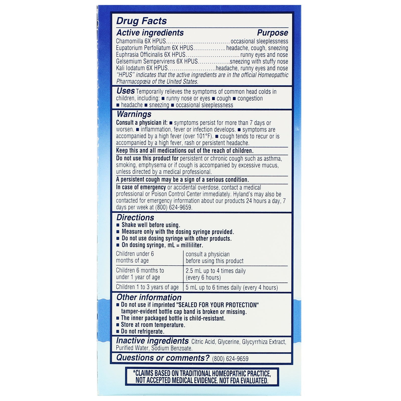 Homeopathic Since 1903 Natural Relief Ages 6 Months + Relief of Runny Nose, Congestion and Occasional Sleeplessness Due to Colds No Alcohol, Artificial Flavors, Dyes or Parabens Trusted by generations of moms, Hyland's has been providing families with comfort and care for over 100 years. Our products are safe & gentle, always made with natural active ingredients with no stimulant side effects. Uses: Temporarily relieves the symptoms of common head colds in children, including: Runny nose or eyes Cough Congestion Headache Sneezing Occasional sleeplessnessSugg. UseShake well before using. Measure only with the dosing syringe provided. Do not use dosing syringe with other products. On dosing syringe, mL= milliliter. Children under 6 months of age - consult a physician before using this product Children 6 months to under 1 year of age - 2.5 ml up to 4 times daily (every 6 hours) Children 1 to 3 years of age -...