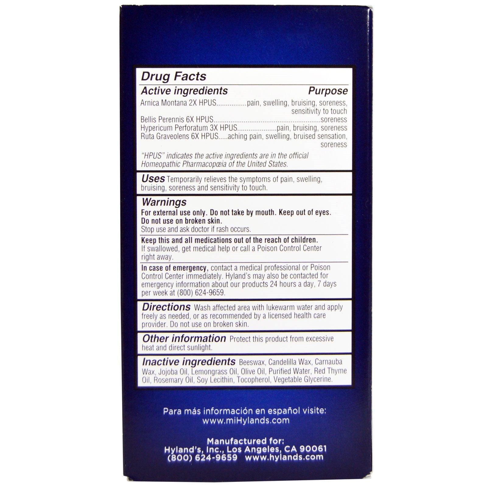 Homeopathic Ages 2-12 Natural Relief Since 1903 Safe & Effective Relief* Bruising · Pain · Swelling Hyland's 4 Kids Bumps 'n Bruises with Arnica Ointment Stick provides safe & effective relief of pain, swelling, bruising and soreness.* Uses Temporarily relieves the symptoms of pain, swelling, bruising, soreness and sensitivity to touch. *The uses for our products are based on traditional homeopathic practice.Sugg. UseWash affected area with lukewarm water and apply freely as needed, or as recommended by a licensed health care provider. Do not use on broken skin.Other IngredientsDrug Facts Active ingredients Purpose Arnica Montana 2X HPUS pain, swelling, bruising, soreness, sensitivity to touch Bellis Perennis 6X HPUS soreness Hypericum Perforatum 3X HPUS pain, bruising, soreness Ruta Graveolens 6X HPUS aching pain, swelling, bruised sensation, soreness Inactive ingredients Beeswax, Candelilla Wax, Carnauba Wax, Jojoba Oil, Lemongrass Oil, Olive Oil, Purified Water, Red Thyme Oil, Rosemary Oil, Soy Lecithin, Tocopherol, Vegetable...