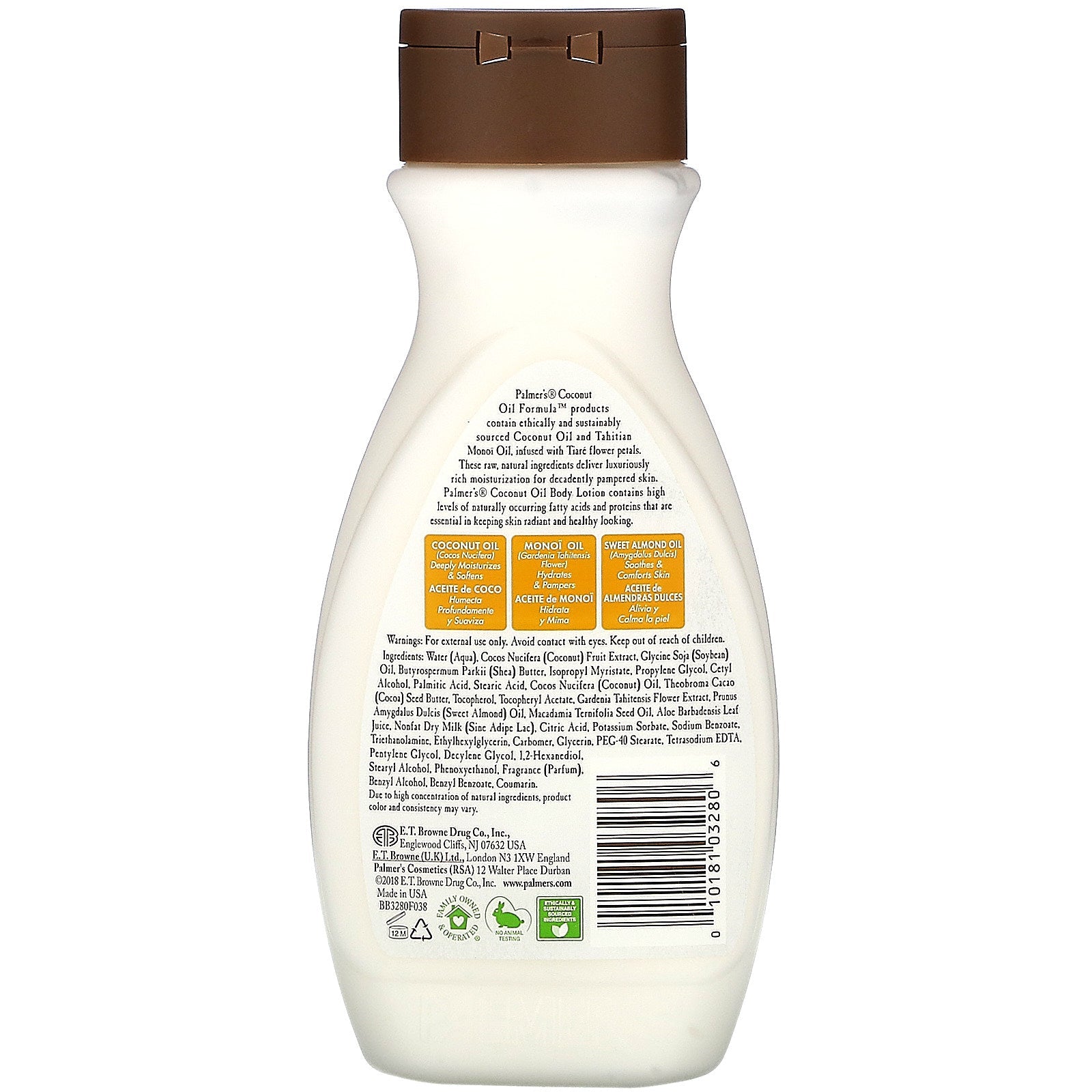 Raw Coconut Oil (Cocos Nucifera) Harvested from the Coconut Palm No Parabens No Phthalates No Mineral Oil No Gluten No Sulfates No Dyes Formulated with Ethically and Sustainably Sourced Ingredients 24 Hour Moisture Made With Fair Trade Coconut Oil and Monoi No Animal Testing Palmer's® Coconut Oil Formula™ products contain ethically and sustainably sourced Coconut Oil and Tahitian Monoi Oil, infused with Tiare flower petals. These raw, natural ingredients deliver luxuriously rich miniaturization for decadently pampered skin. Palmer's® Coconut Oil Body Lotion contains high levels of naturally occurring fatty acids and proteins that are essential is keeping skin radiant and healthy looking. Coconut Oil (Cocos Nucifera) Deeply Moisturizes & Softens Monoi Oil (Gardenia Tahitensis Flower) Hydrates & Pampers Sweet Almond Oil (Amygdalus Dulcis) Soothes & Comforts SkinSugg. UseOther IngredientsWater, cocos nucifera (coconut) fruit extract, glycine soja oil, butyrospermum parkii (shea) butter, stearic acid, isopropyl myristate, propylene glycol, cetyl alcohol, palmitic...