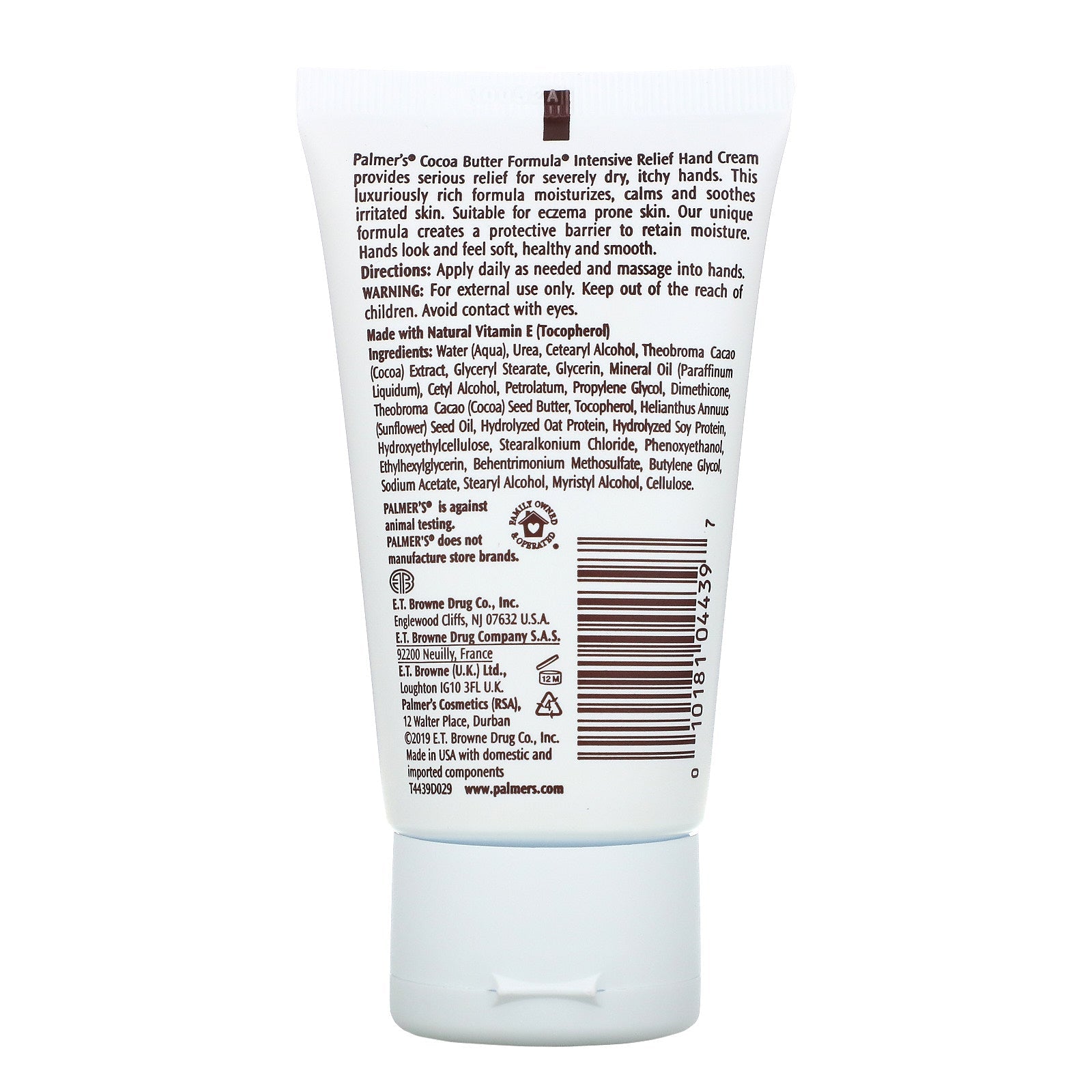 For Itchy Skin, Irritated Skin, Severely Dry Skin, Prone to Eczema Paraben Free Dermatologically Tested 24 Hour Moisture Made with Natural Vitamin E (Tocopherol) Palmer's® is Against Animal Testing Palmer's® Cocoa Butter Formula® Intensive Relief Hand Cream provides serious relief for severely dry, itchy hands. This luxuriously rich formula moisturizes, calms and soothes irritated skin. Suitable for eczema prone skin. Our unique formula creates a protective barrier to retain moisture. Hands look and feel soft, healthy and smooth.Sugg. UseApply daily as needed and massage into hands.Other IngredientsWater (aqua), urea, cetearyl alcohol, theobroma cacao (cocoa) extract, glyceryl stearate, glycerin, mineral oil (paraffinum liquidum), cetyl alcohol, petrolatum, propylene glycol, dimethicone, theobroma cacao (cocoa) seed butter, tocopherol, helianthus annuus (sunflower) seed oil, hydrolyzed oat protein, hydrolyzed soy protein, hydroxyethylcellulose, stearalkonium chloride, phenoxyethanol, ethylhexylglycerin, behentrimonium methosulfate, butylene glycol, sodium acetate, stearyl alcohol, myristyl alcohol, cellulose.Supplement FactsDisclaimerWhile VitaminsUK strives to ensure the accuracy of its...