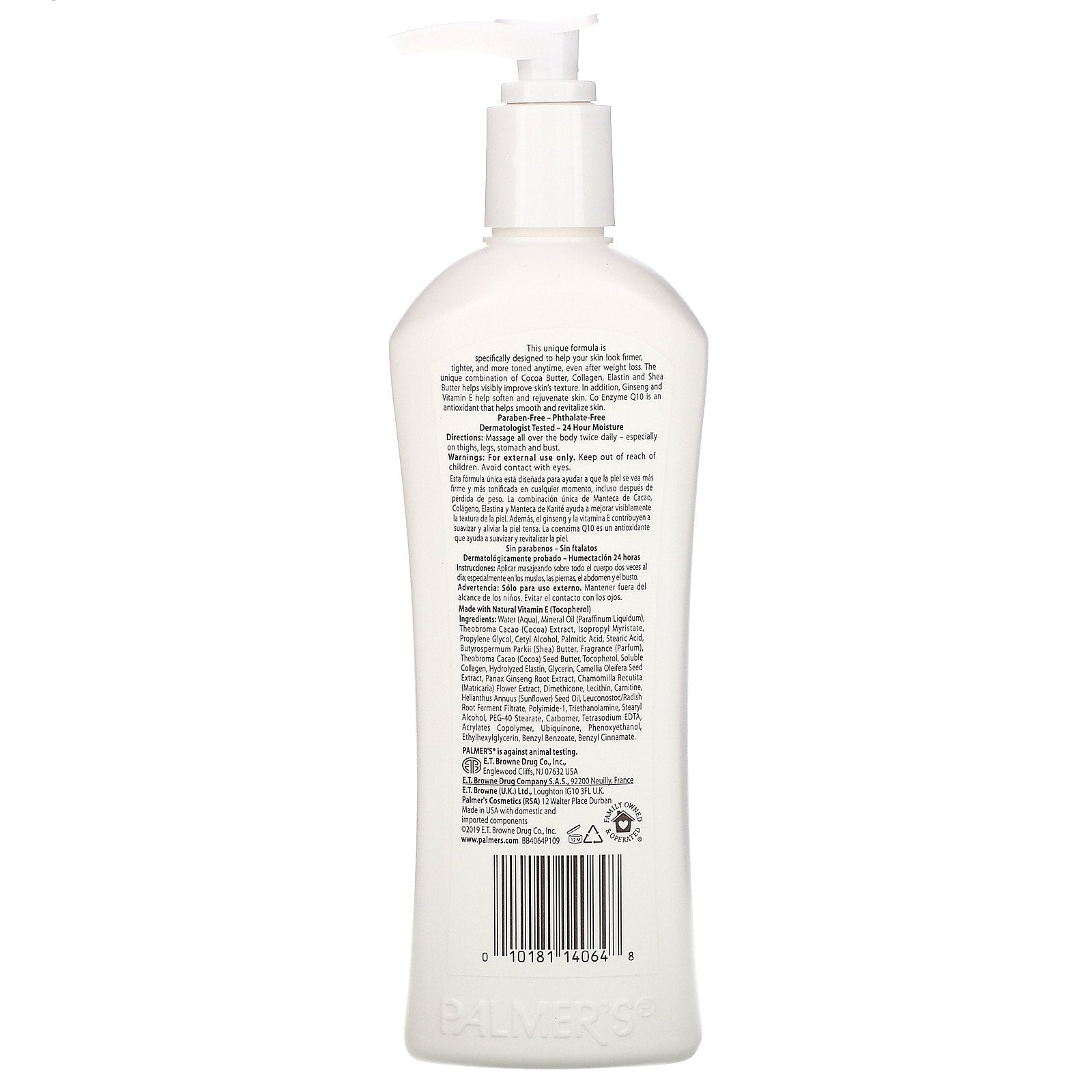 With Shea Butter, Collagen Elastin & Vitamin E Plus Q10 Tightens Skin Firms & Tones Paraben Phthalate Free Dermatologist Tested This unique formula is specifically designed to firm, tighten and tone your skin, anytime, even after weight loss. The unique combination of Cocoa Butter, Collagen, Elastin and Shea Butter helps support skin elasticity and texture. In addition, Ginseng and Vitamin E help soften and rejuvenate skin. Co Enzyme Q10 is an antioxidant that helps smooth and revitalize skin.Sugg. UseMassage all over the body twice daily- especially on thighs, legs, stomach and bust.Other IngredientsWater (aqua), mineral oil (paraffinum liquidum), theobroma cacao (cocoa) extract, stearic acid, isopropyl myristate, cetyl alcohol, polyimide-1, propylene glycol theobroma cacao (cocoa) seed butter, butyrospermum parkii (shea) butter fragrance (parfum), glycerin, triethanolamine, PEG-40 stearate, carbomer, dimethicone, tocopheryl acetate, tetrasodium EDTA, acrylates copolymer, hydrolyzed elastin, soluble collagen, camellia oleifera leaf extract, panax ginseng root extract, chamomilla recutita (matricaria) flower...