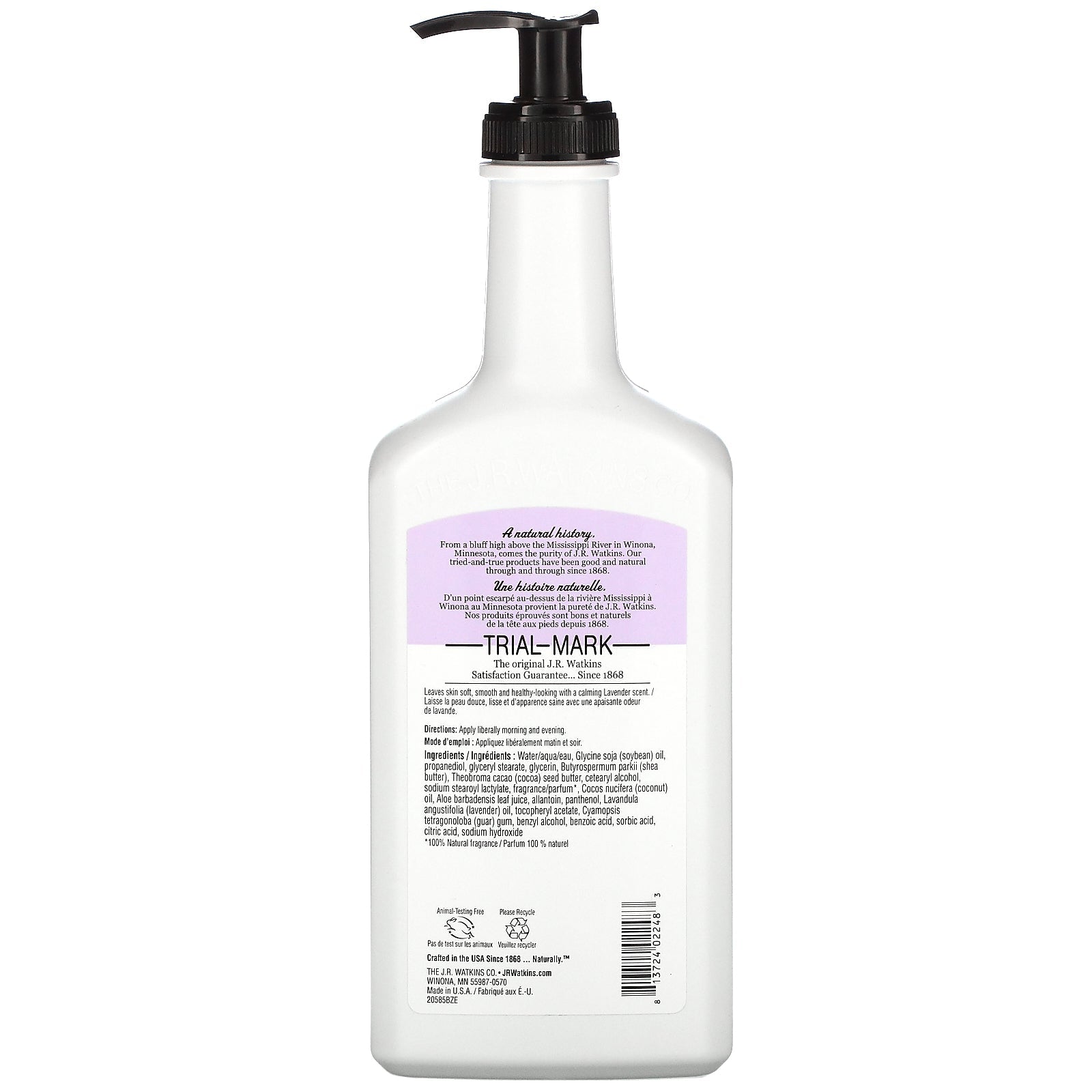 Since 1868 Free Yourself Paraben-Free, Phthalate-Free, Propylene Glycol-Free, Dye-Free 99% Natural Animal-Testing Free Leaping Bunny Certified A natural history. From a bluff high above the Mississippi River in Winona, Minnesota, comes the purity of J.R. Watkins. Our tried-and-true products have been good and natural through and through since 1868. Leaves skin soft, smooth and healthy-looking with a calming lavender scent.Sugg. UseApply liberally morning and evening.Other IngredientsWater, glycine soja (soybean) oil, propanediol, glyceryl stearate, glycerin, butyrospermum parkii (shea butter), theobroma cacao (cocoa) seed butter, cetearyl alcohol, sodium stearoyl lactylate, fragrance*, cocos nucifera (coconut) oil, aloe barbadensis leaf juice, allantoin, panthenol, lavandula angustifolia (lavender) oil, tocopheryl acetate, cyamopsis tetragonoloba (guar) gum, benzyl alcohol, benzoic acid, sorbic acid, citric acid, sodium hydroxide. *100% natural fragranceSupplement FactsDisclaimerWhile VitaminsUK strives to ensure the accuracy of its product images and information, some manufacturing changes to packaging and/or ingredients may be pending update on our site. Although...