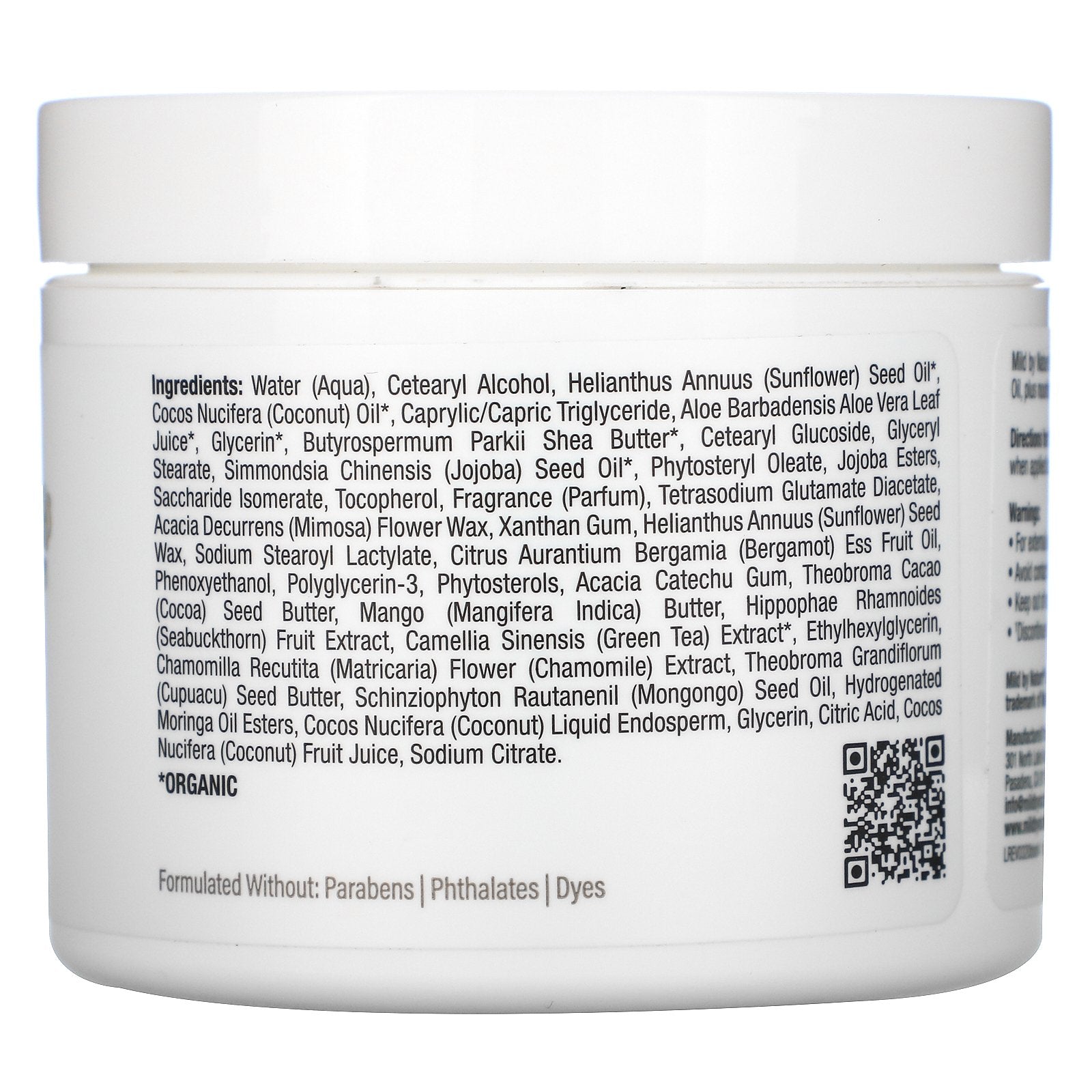 Water (Aqua), Cetearyl Alcohol, Helianthus Annuus (Sunflower) Seed Oil*, Cocos Nucifera (Coconut) Oil*, Caprylic/Capric Triglyceride, Aloe Barbadensis Aloe Vera Leaf Juice*, Glycerin*, Butyrospermum Parkii Shea Butter*, Cetearyl Glucoside, Glyceryl Stearate, Simmondsia Chinensis (Jojoba) Seed Oil*, Phytosteryl Oleate, Jojoba Esters, Saccharide Isomerate, Tocopherol, Fragrance (Parfum), Tetrasodium Glutamate Diacetate, Acacia Decurrens (Mimosa) Flower Wax, Xanthan Gum, Helianthus Annuus (Sunflower) Seed Wax, Sodium Stearoyl Lactylate, Citrus Aurantium Bergamia (Bergamot) Ess Fruit Oil, Phenoxyethanol, Polyglycerin-3, Phytosterols, Acacia Catechu Gum, Theobroma Cacao (Cocoa) Seed Butter, Mango (Mangifera Indica) Butter, Hippophae Rhamnoides (Seabuckthorn) Fruit Extract, Camellia Sinensis (Green Tea) Extract*, Ethylhexylglycerin, Chamomilla Recutita (Matricaria) Flower (Chamomile) Extract, Theobroma Grandiflorum (Cupuacu) Seed Butter, Schinziophyton Rautanenil (Mongongo) Seed Oil, Hydrogenated Moringa Oil Esters, Cocos Nucifera (Coconut) Liquid Endosperm, Glycerin, Citri Acid, Cocos Nucifera (Coconut) Fruit Juice, Sodium Citrate. *ORGANICSupplement Facts