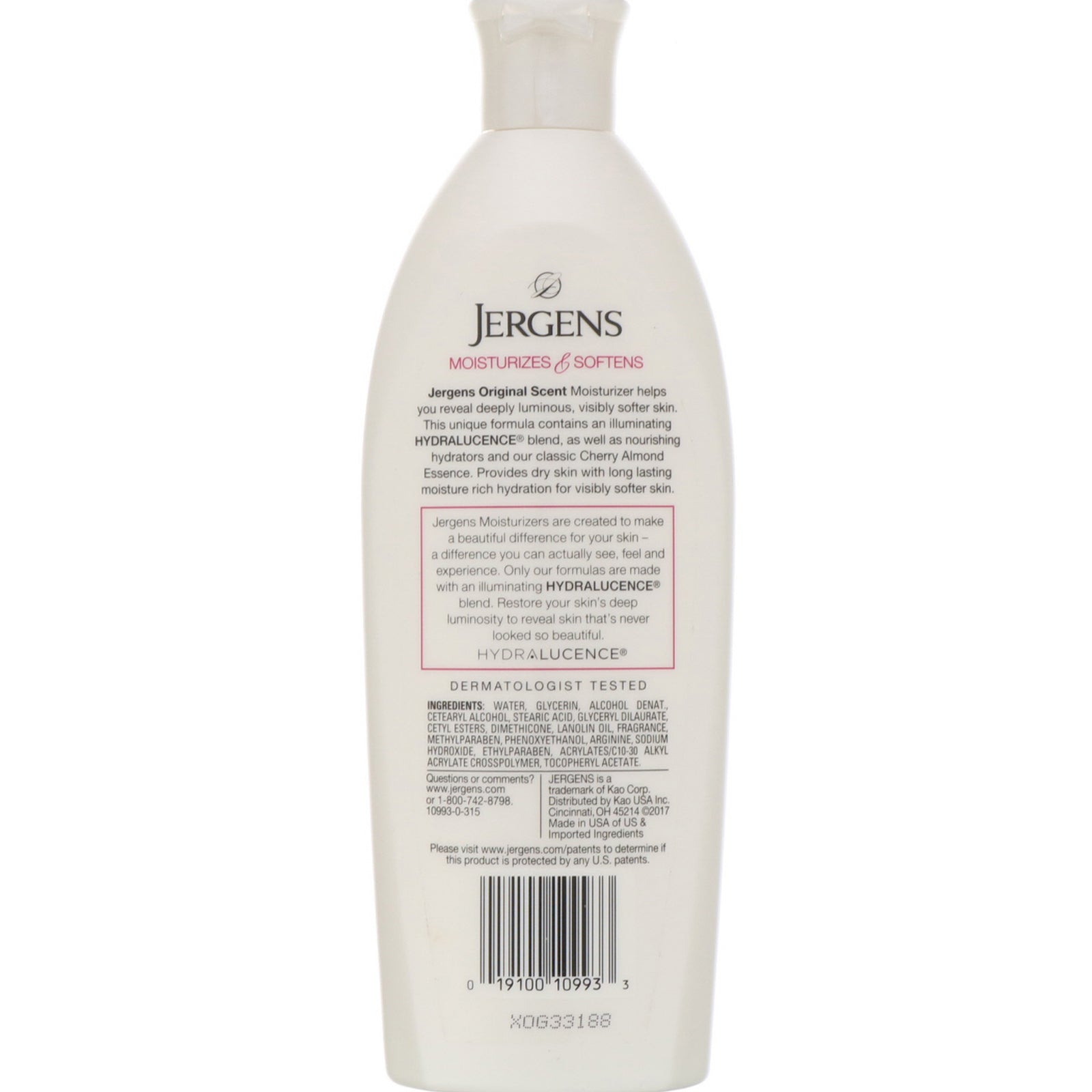 Long Lasting Moisture for Beautifully Soft Skin With Cherry Almond Essence Moisturizes & Softens Dermatologist Tested Jergens Original Scent Moisturizer helps you reveal deeply luminous, visibly softer skin. This unique formula contains an illuminating HYDRALUCENCE® blend, as well as nourishing hydrators and our classic Cherry Almond Essence. Provides dry skin with long lasting moisture rich hydration for visibly softer skin. Jergens Moisturizers are created to make a beautiful difference for your skin - a difference you can actually see, feel and experience. Only our formulas are made with an illuminating HYDRALUCENCE® blend. Restore your skin's deep luminosity to reveal skin that's never looked so beautiful. HYDRALUCENCE® .Sugg. UseOther IngredientsWater, glycerin, alcohol denat., cetearyl alcohol, stearic acid, glyceryl dilaurate, cetyl esters, dimethicone, lanolin oil, fragrance, methylparaben, phenoxyethanol, arginine, sodium hydroxide, ethylparaben, acrylates/c10-30 alkyl acrylate crosspolymer, tocopheryl acetate.Supplement FactsDisclaimerWhile VitaminsUK strives to ensure the accuracy of its product images and information, some...