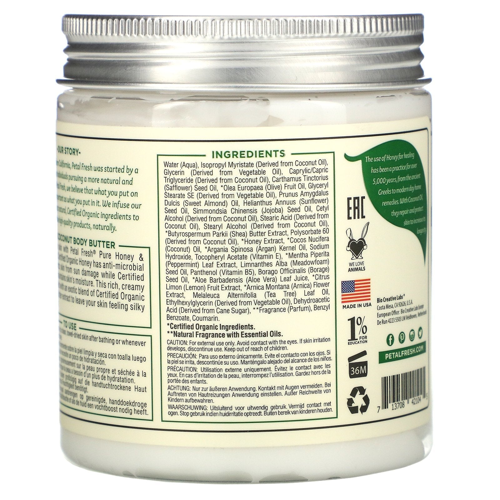 Pure Heals, Repairs & Protects Skin Made Natural with Blend of Botanicals pH Balanced Vegan Gluten-Free Sustainably Sourced We Love Animals - Our Story - Based in sunny Southern California, Petal Fresh was started by a group of passionate individuals pursuing a more natural and healthy lifestyle. At Petal Fresh, we believe that what you put on your body is just as important as what you put in it. We infuse our formulas with the most natural, Certified Organic ingredients to create effective high-quality products, naturally. Honey & Coconut Body Butter Hydrate and restore skin with Petal Fresh® Pure Honey & Coconut Body Butter. Certified Organic Honey has anti-microbial properties and protects skin from sun damage while Certified Organic Coconut Oil maintains skin's moisture. This rich, creamy formula is also fortified with an exotic blend of Certified Organic Argan Oil and Shea Butter extract to leave your skin feeling silky smooth to the touch. The use of Honey for healing has been a practice for over 5,000 years, from the ancient Greeks to modern day home remedies. With coconut oil, they repair and protect skin to increase its longevity.