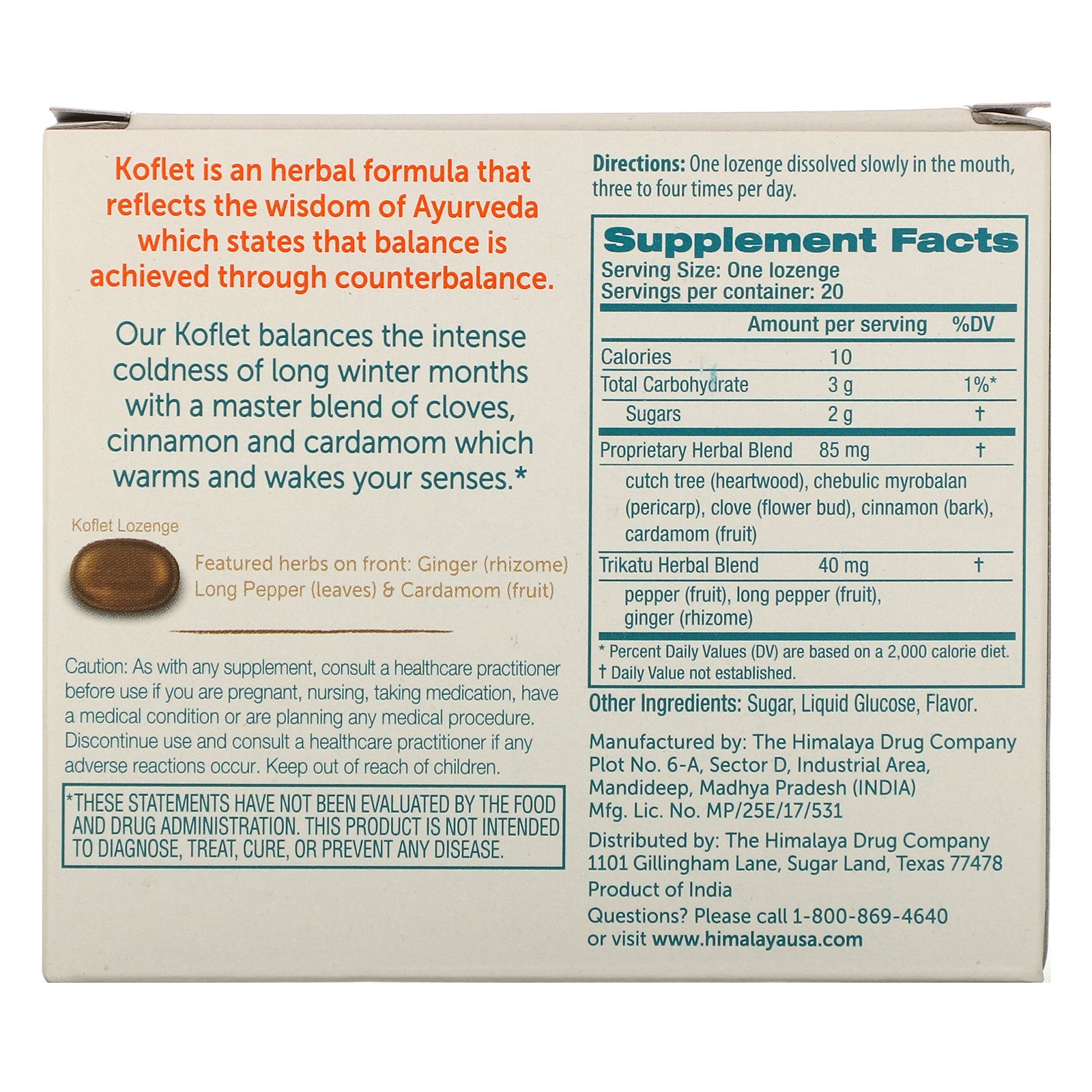 Since 1930 Happiness Through Wellness Warms, Soothes & Comforts Includes Ginger, Long Pepper & Cardamom Herbal Supplement Family Owned For More Than 85 Years Koflet is an herbal formula that reflects the wisdom of Ayurveda which states that balanc