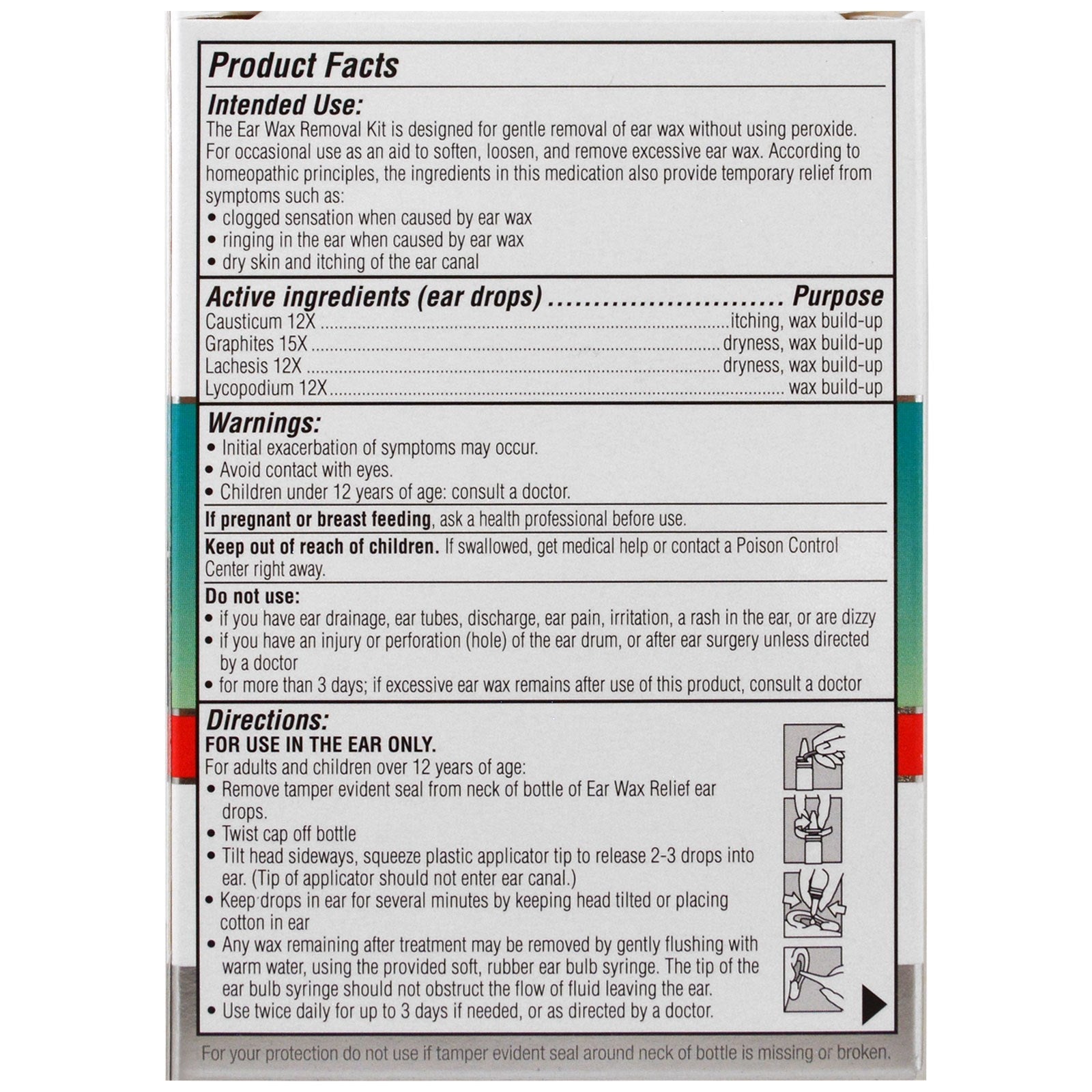 Peroxide Free Formulated with Natural Active Ingredients Homeopathic Original Swiss Formula Contains: (1) Ear Wax Relief ear drops 10 ml/0.33 fl oz (1) Ear Bulb syringe Multi-Symptom Relief Removes Wax Cleans Ears Non-Drying This Ear Wax Removal Kit is de